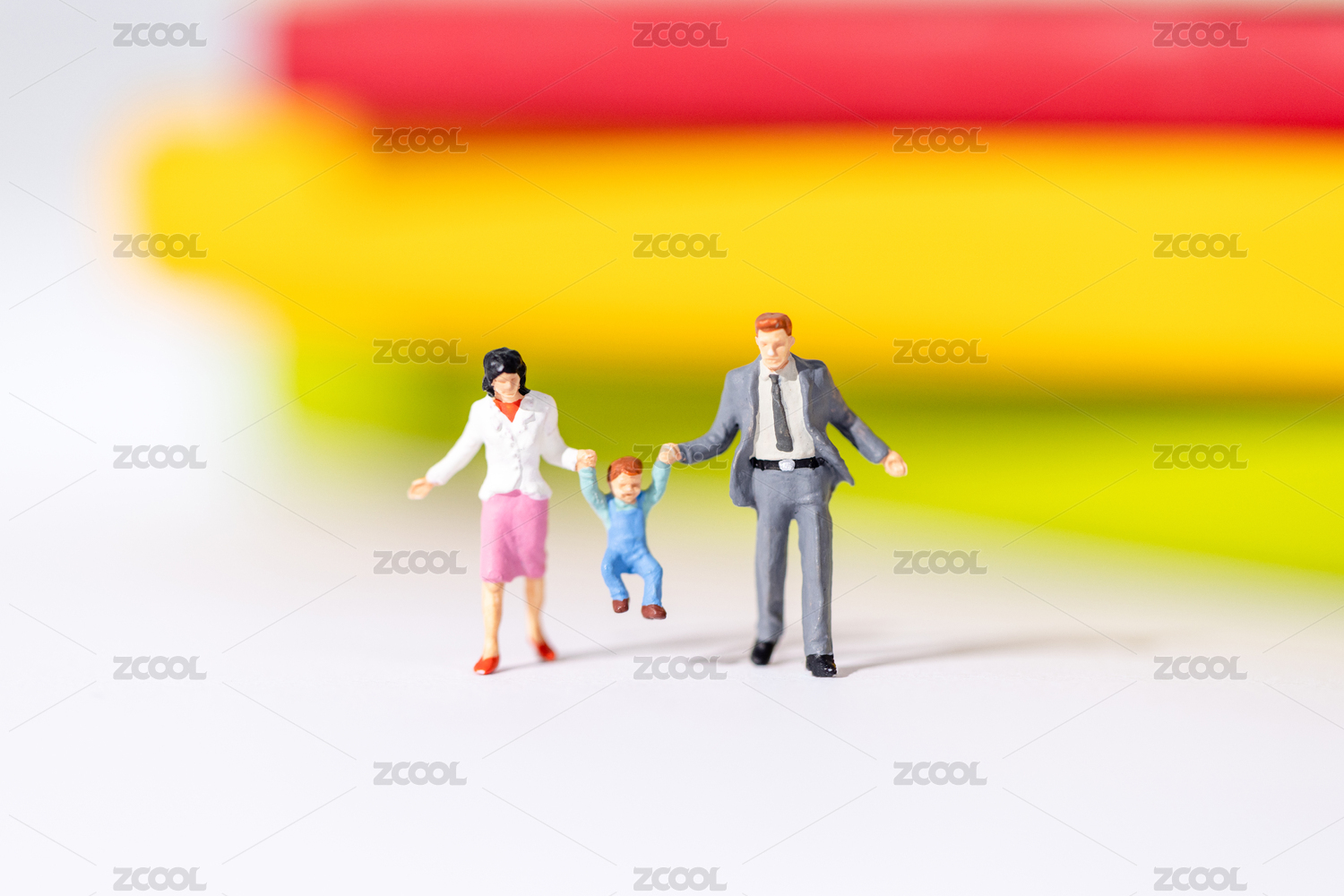 年轻父母带着三个孩子缩微小人概念