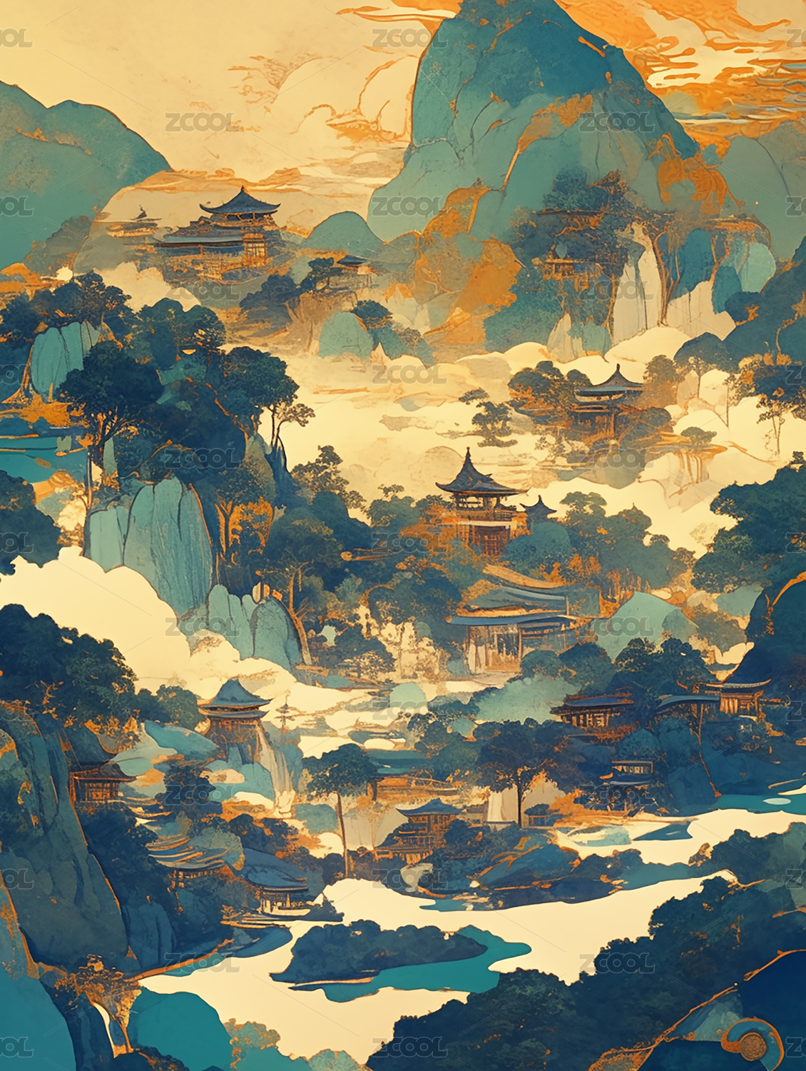 aigc,中国风,水墨,国画,亭子,月光,山,湖,岛,树