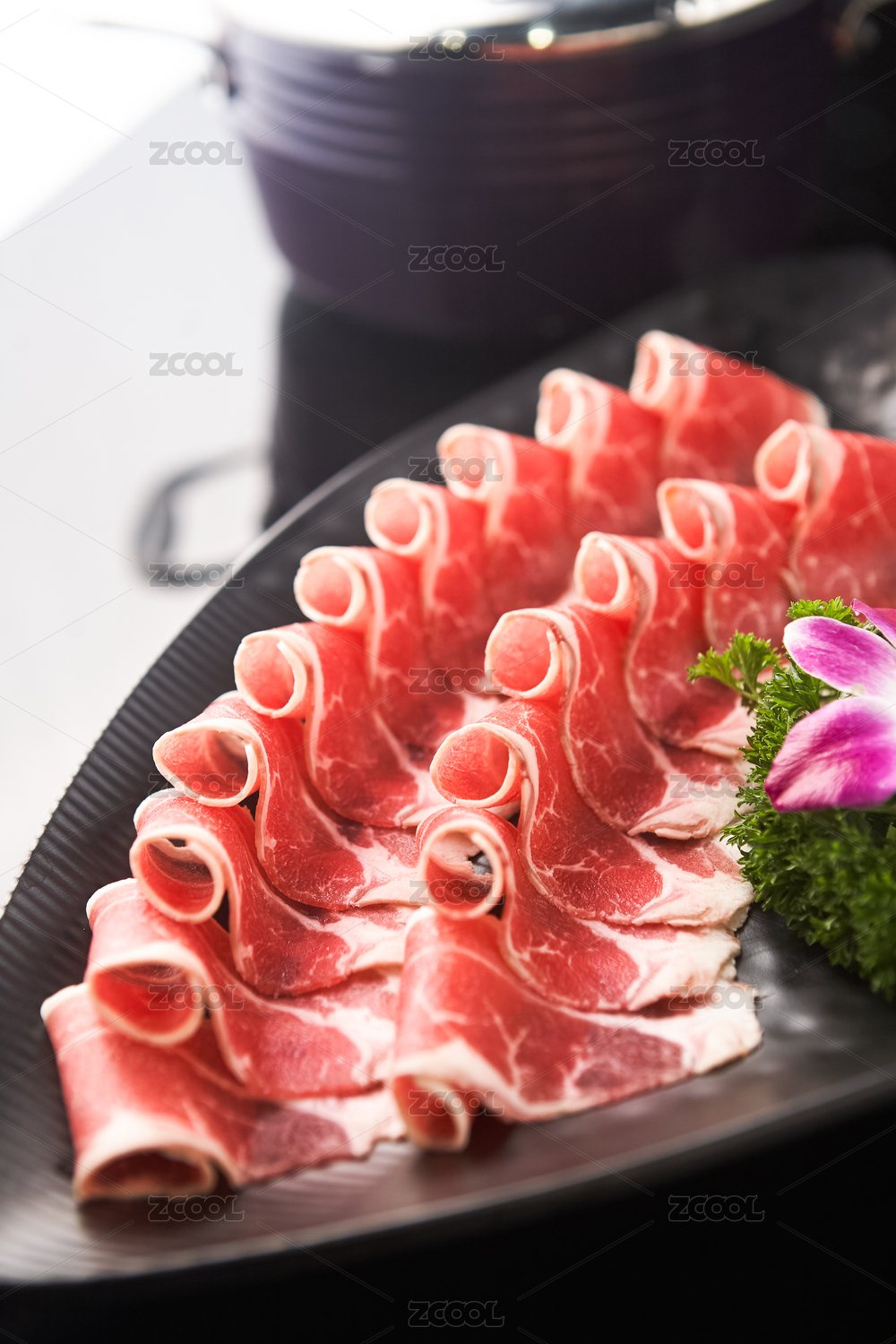 干冰缭绕的背景上摆放的牛羊肉卷双拼