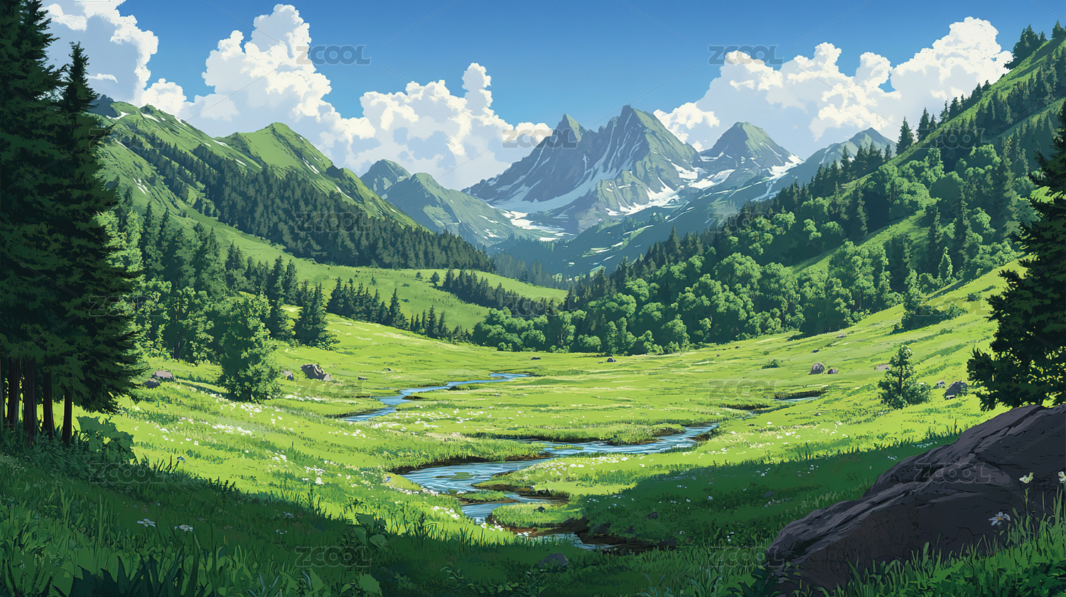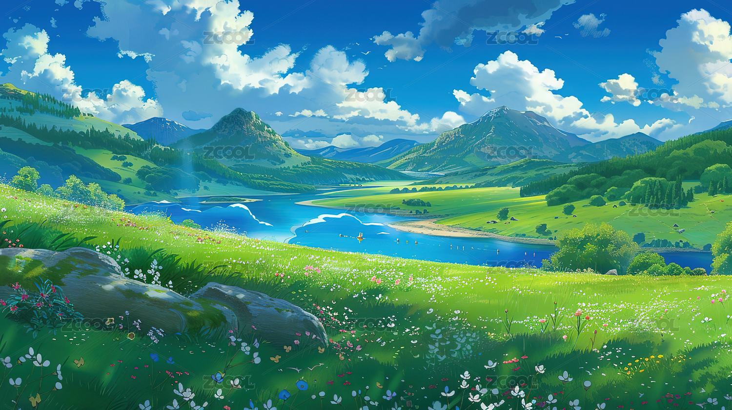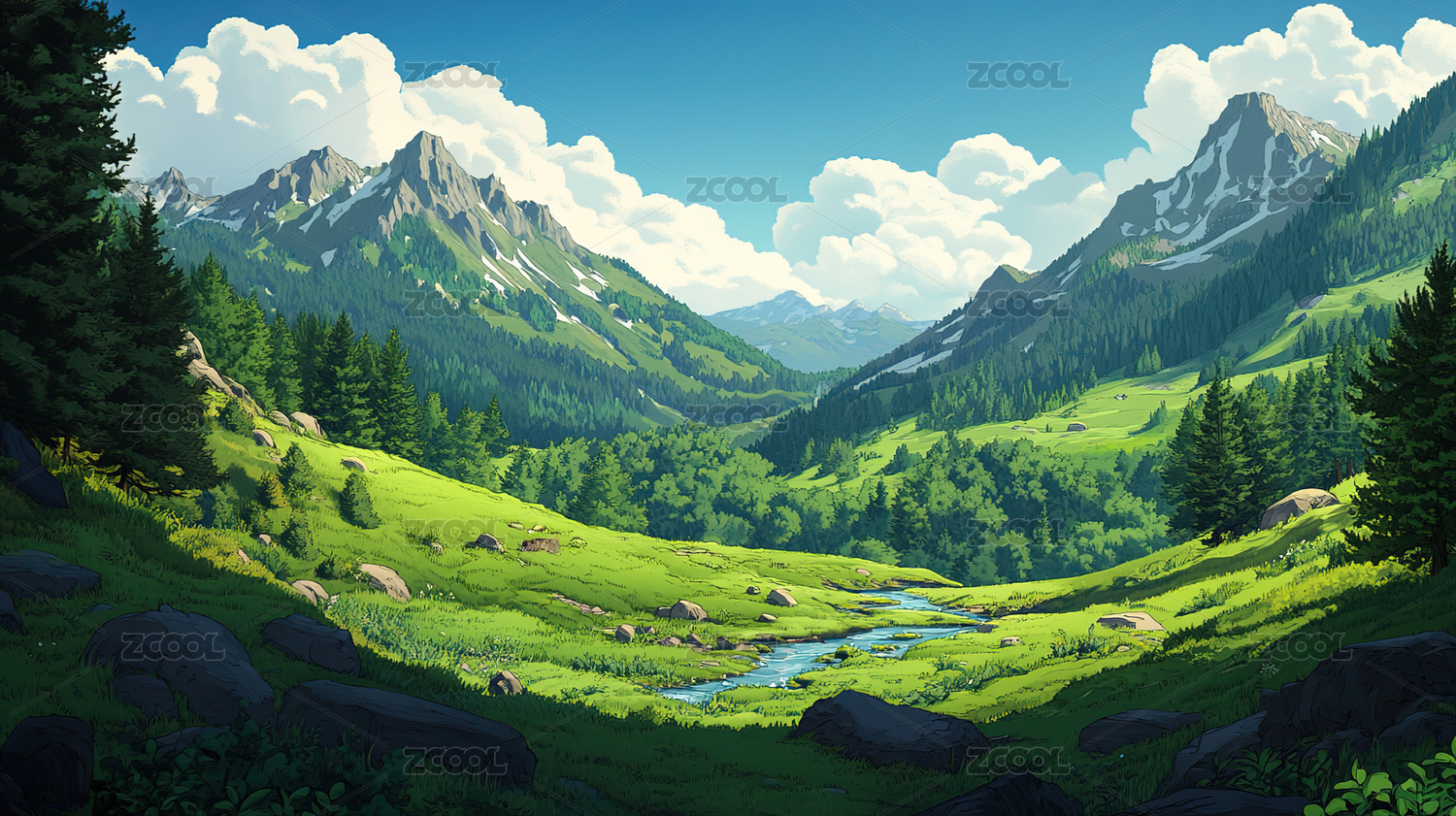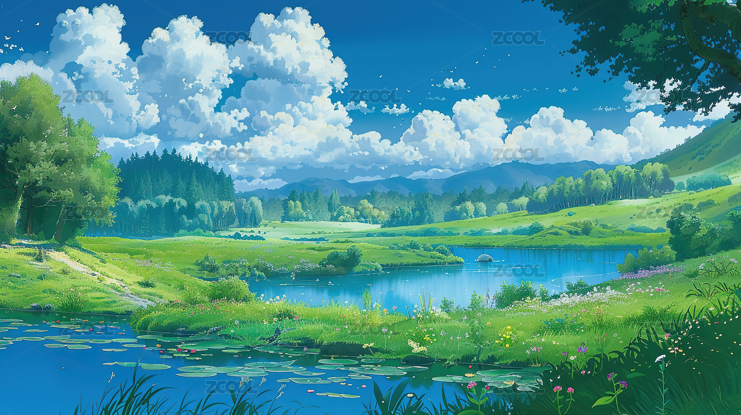 蓝天云朵青山绿野治愈系动漫风景插画背景素