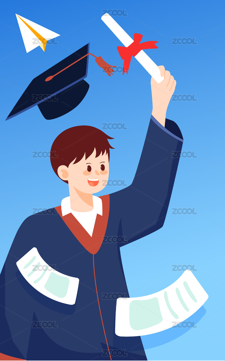 学生,插画,开心,男生,书,学士服,学士帽,文具,暖色,纸