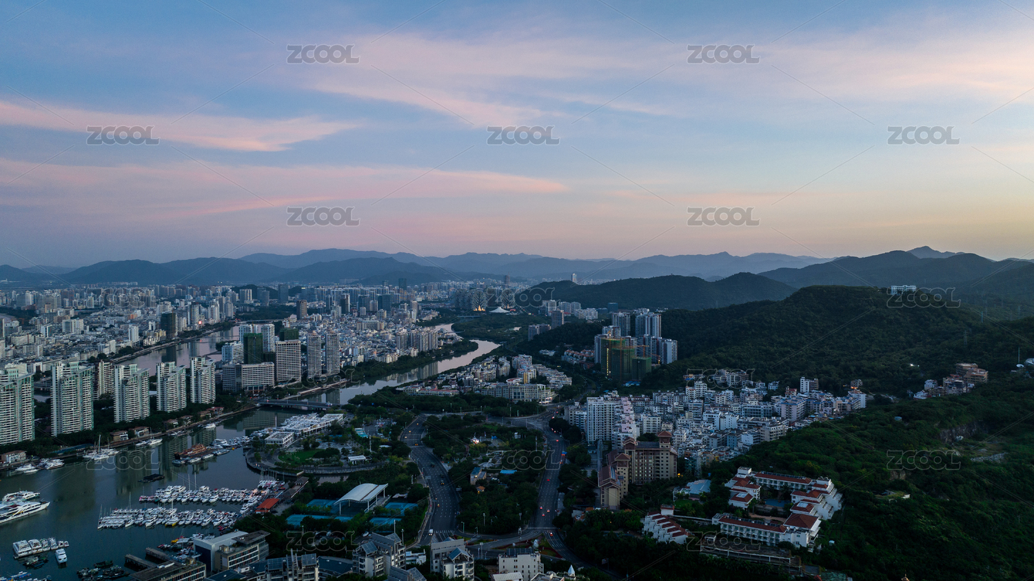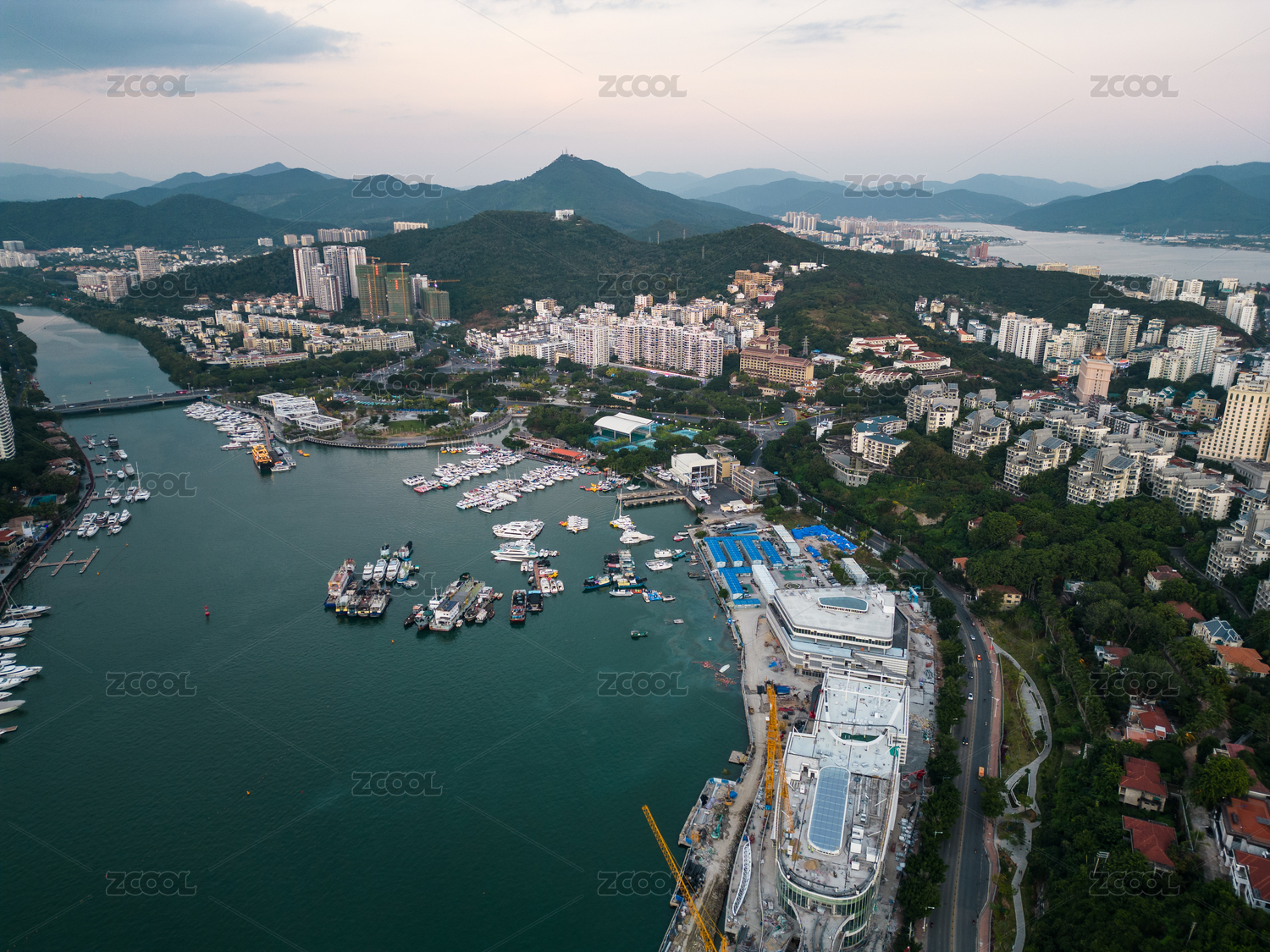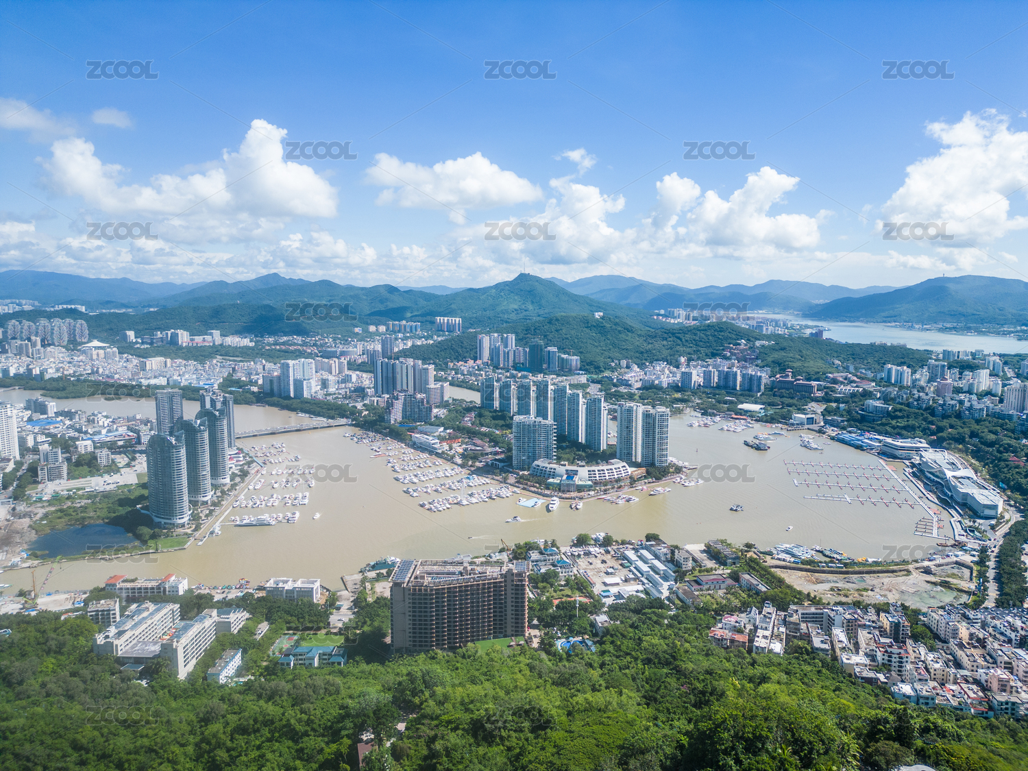 海南三亚三亚湾游艇基地三亚河高视角航拍城