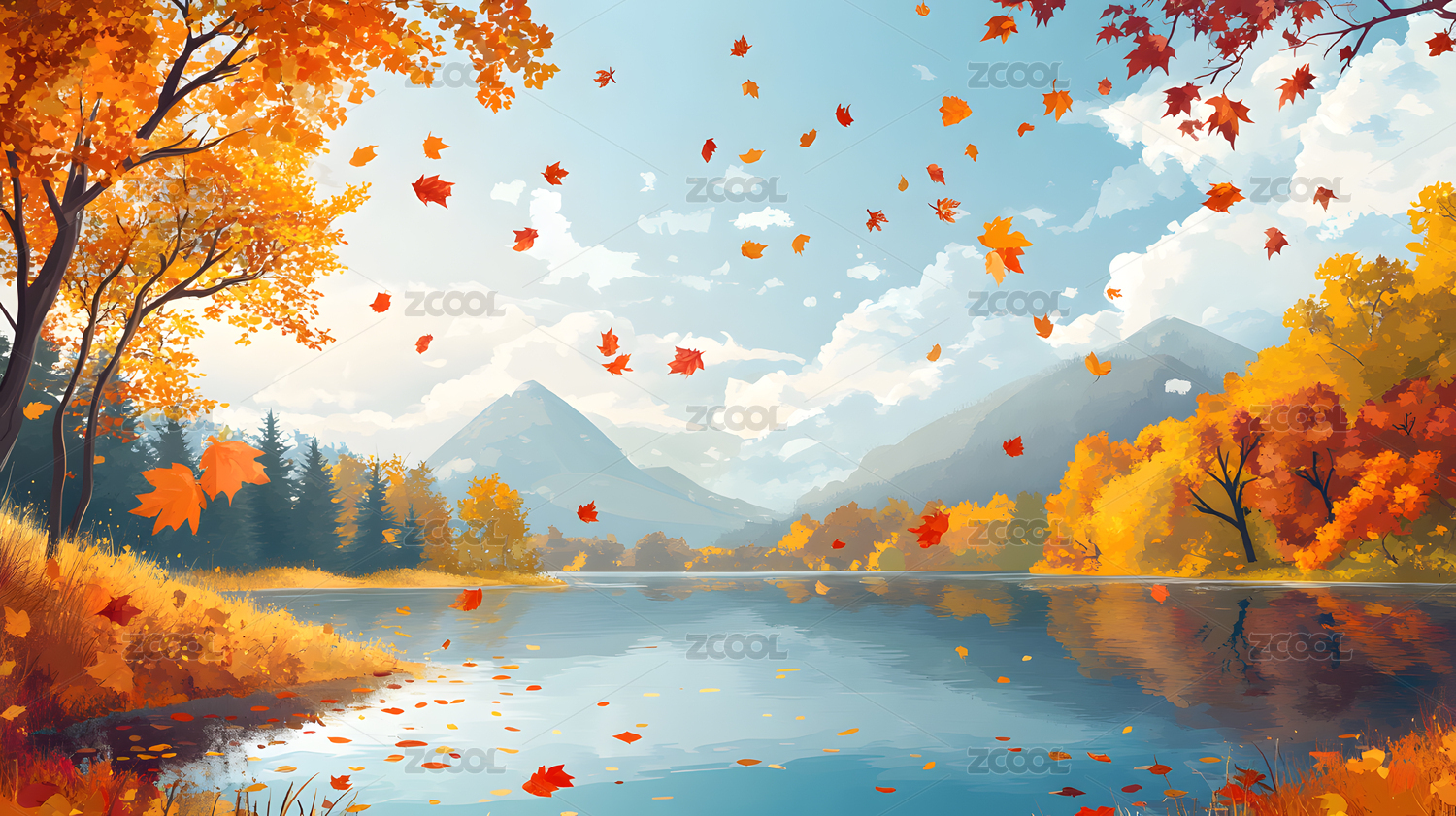 秋天的山林湖泊插画