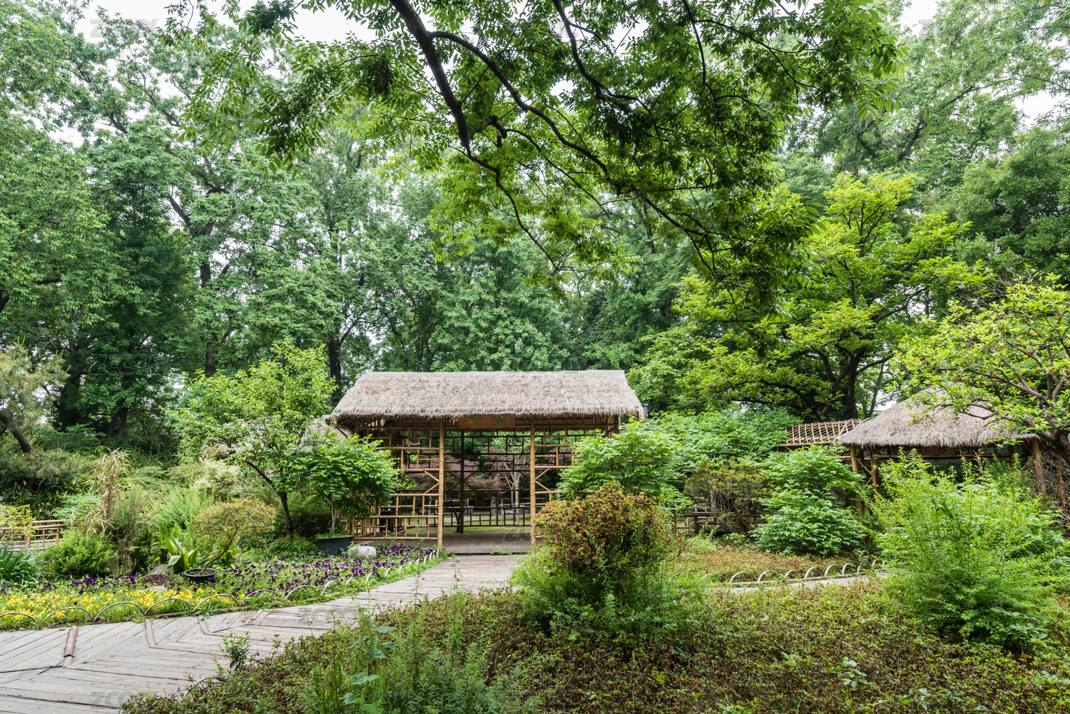 四川成都浣花溪公园园林仿古农家茅屋柴门