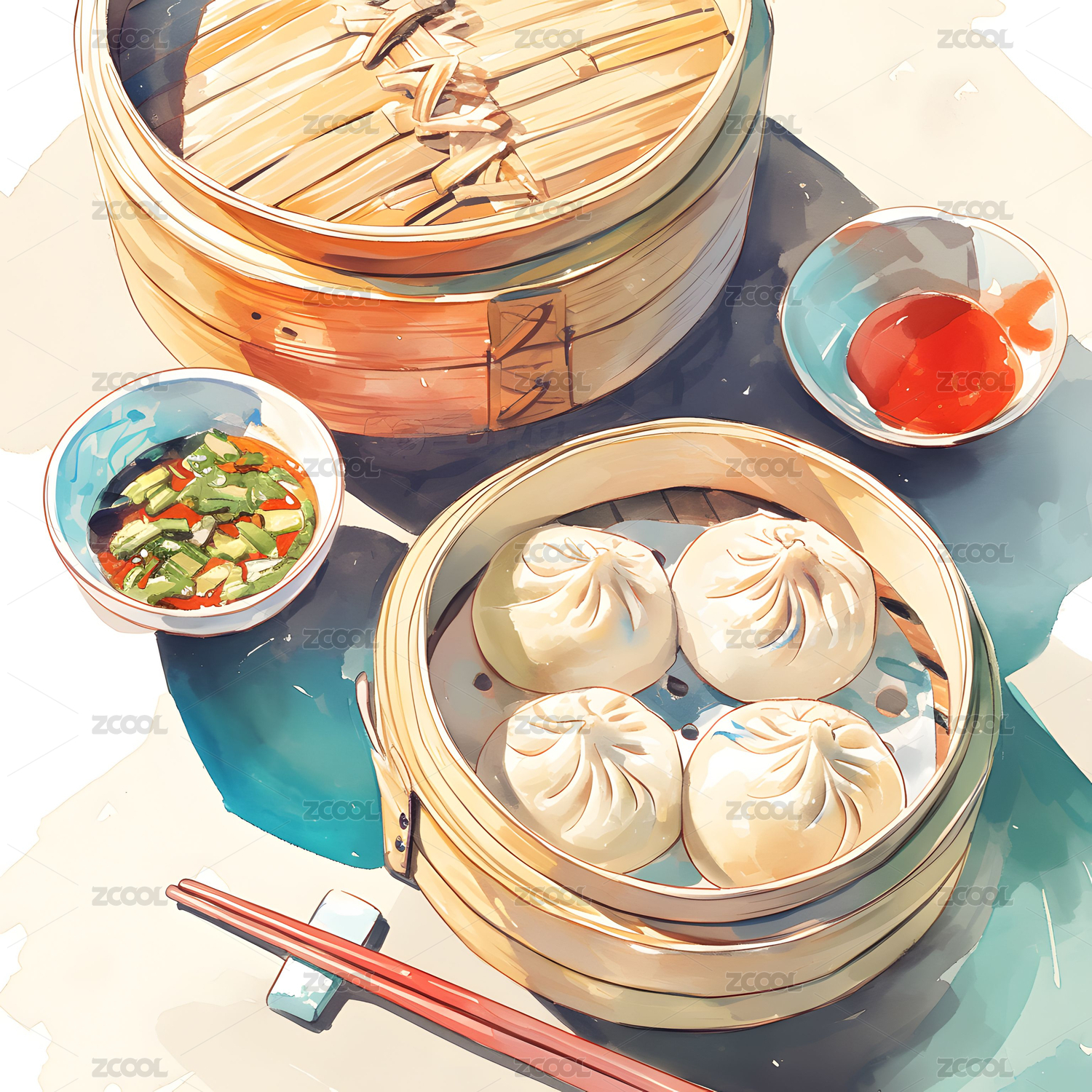 AIGCFG,中国风,水墨,插画,中式风格,国潮风,包子,小笼包,美食,食物
