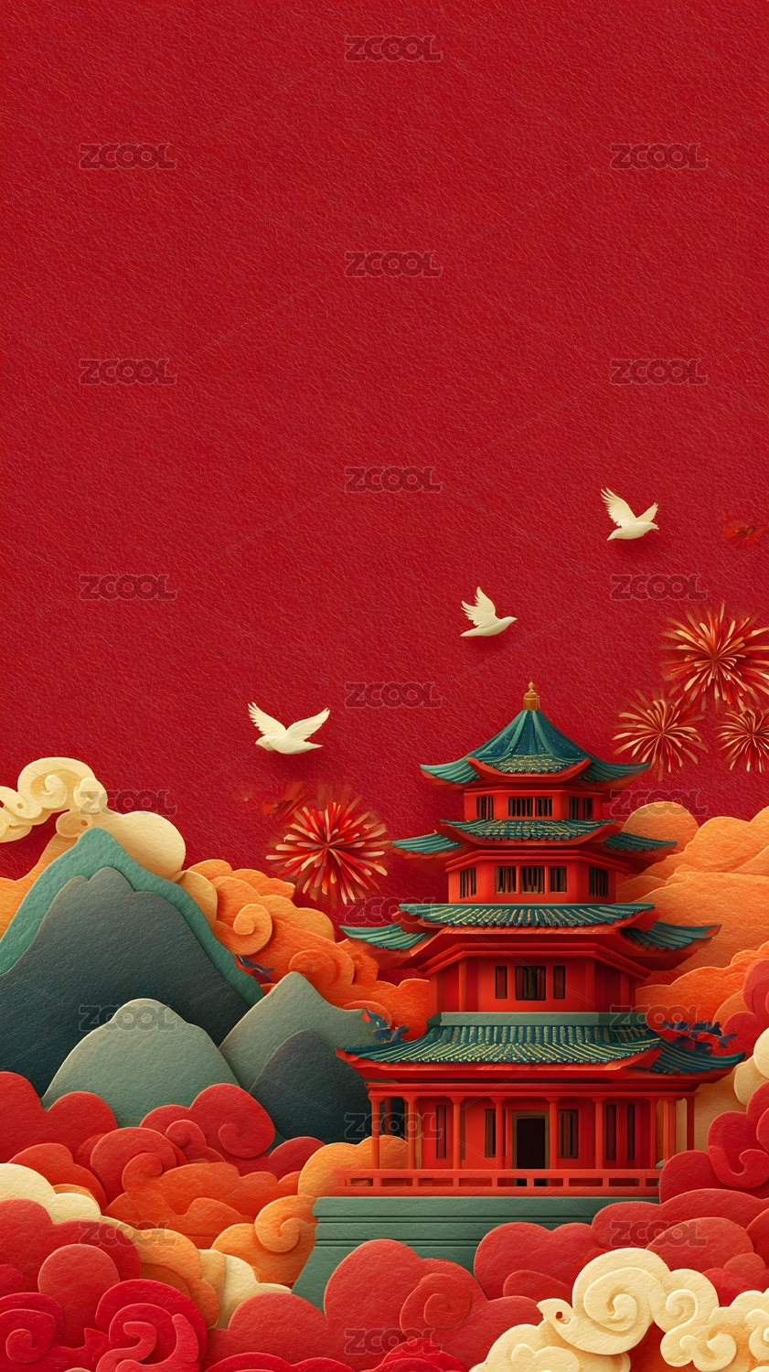 中国风,国潮风,节日,立体,古代,建筑,插画,红墙,国庆节,祥云