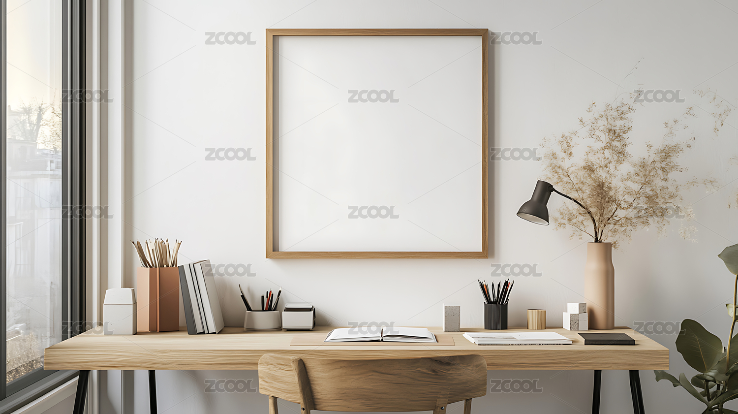 纯色,背景,书桌,简约,台灯,相框,绿植,办公,布景,特写