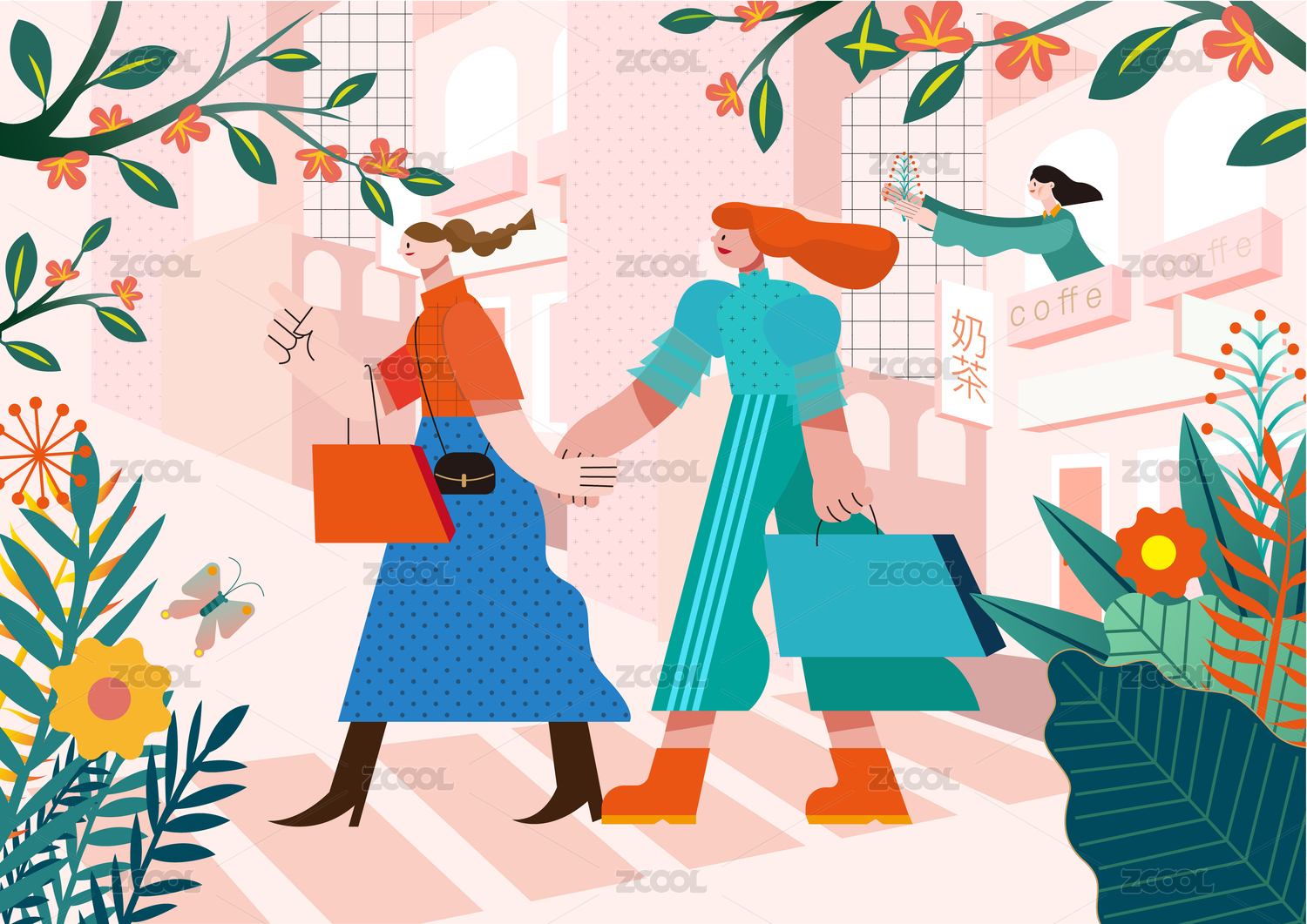 男人,女人,男生,女生,城市,街道,窗户,粉色,购物袋,男性