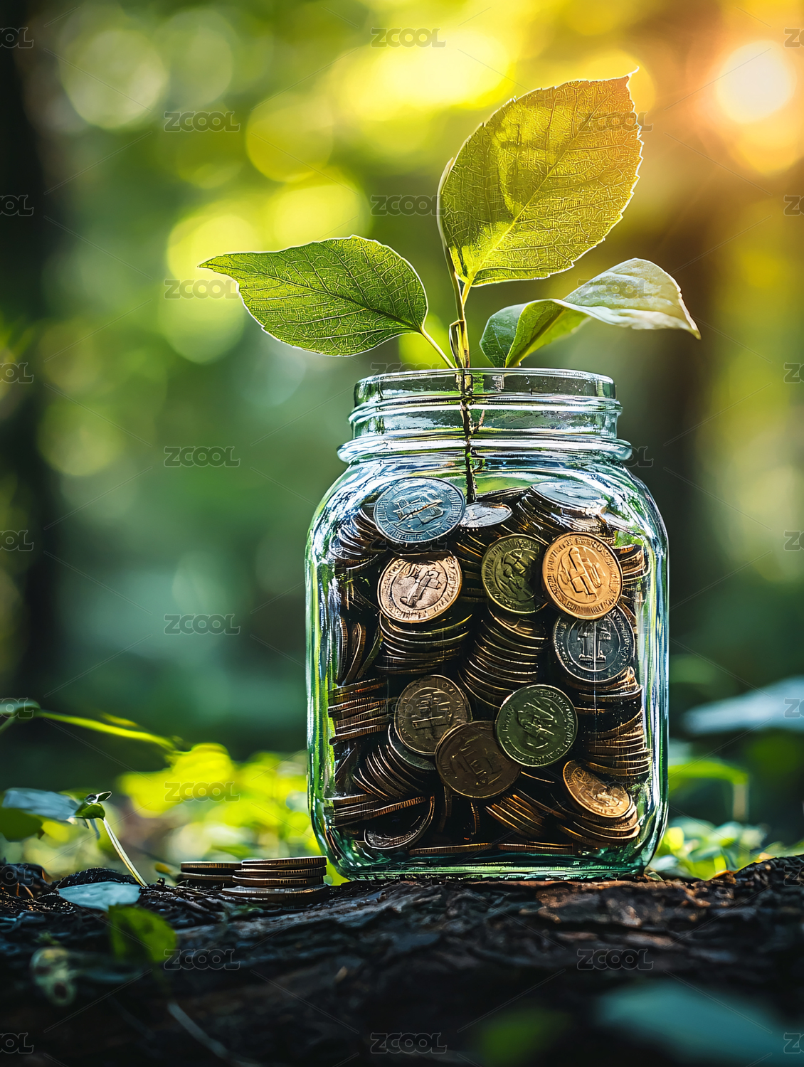 绿色植物与储蓄罐中的硬币