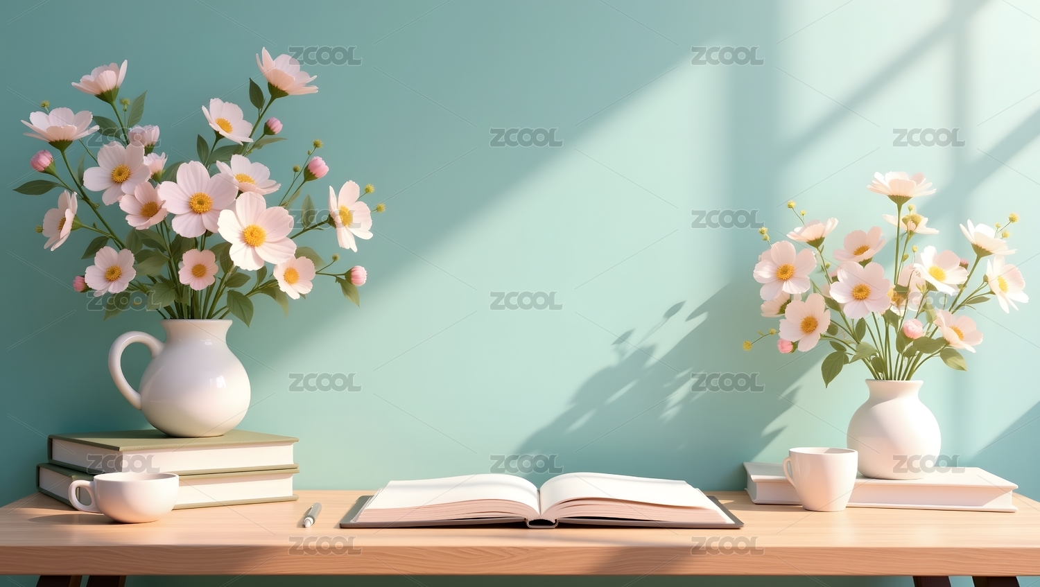 夏天的午后窗边的桌上的鲜花咖啡和书
