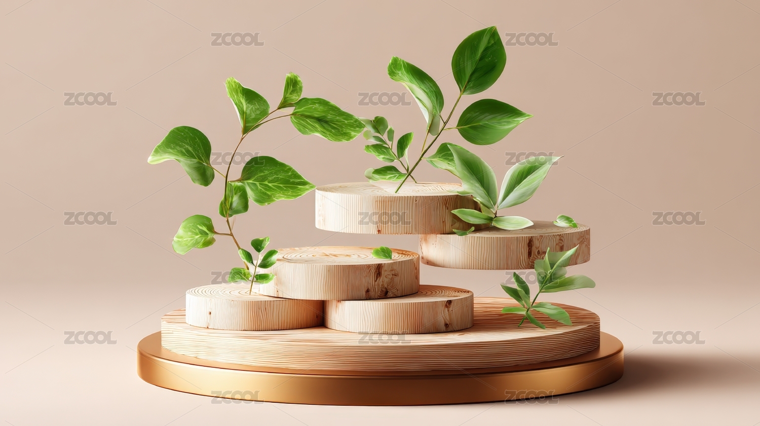 木质展示台和绿色植物装饰