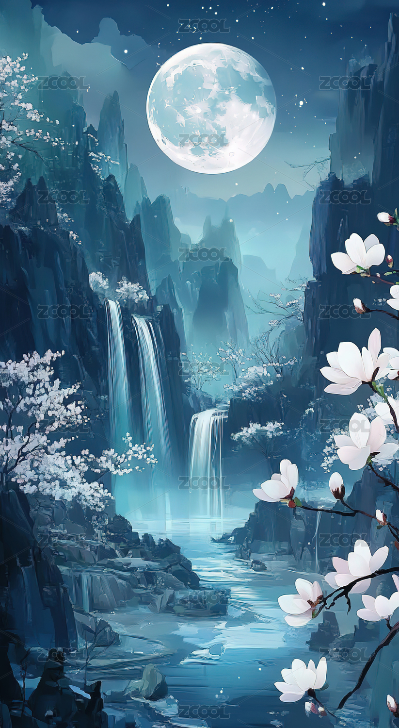 夜晚星空下,月亮将月光撒在山峰上背景插画