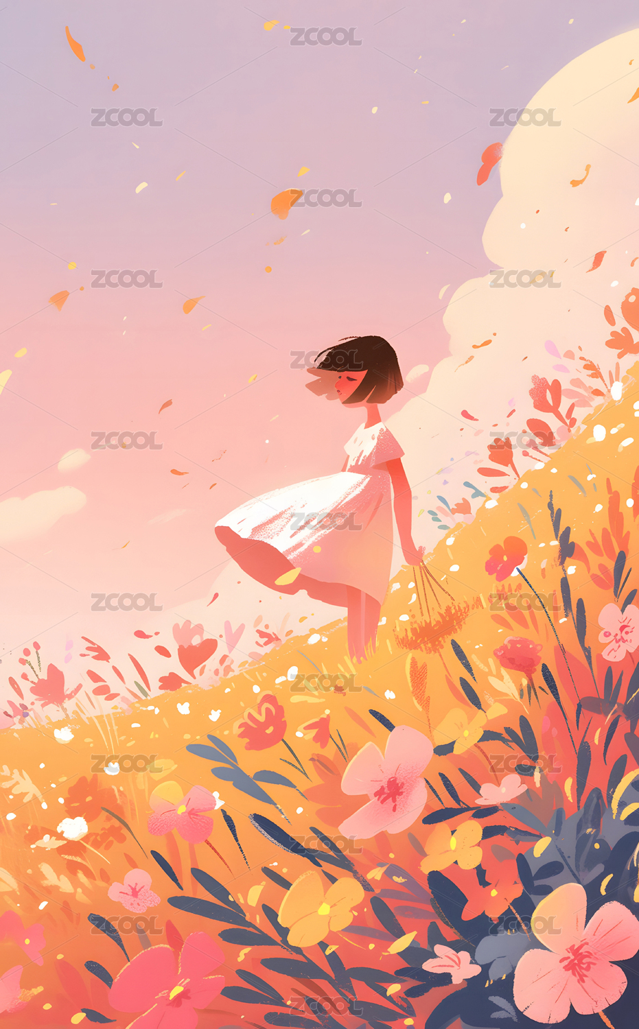 飘着花瓣粉色唯美天空下的母女温馨重阳节插画竖版叶子