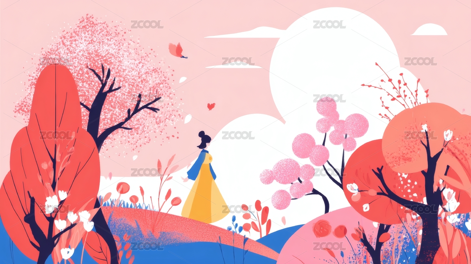 HETCCSV2020,春天,樱花,热气球,女孩,花草,粉色,温暖,插画,背景