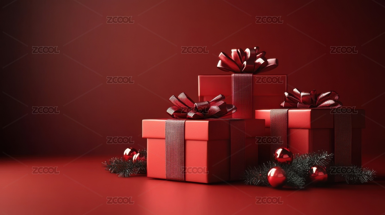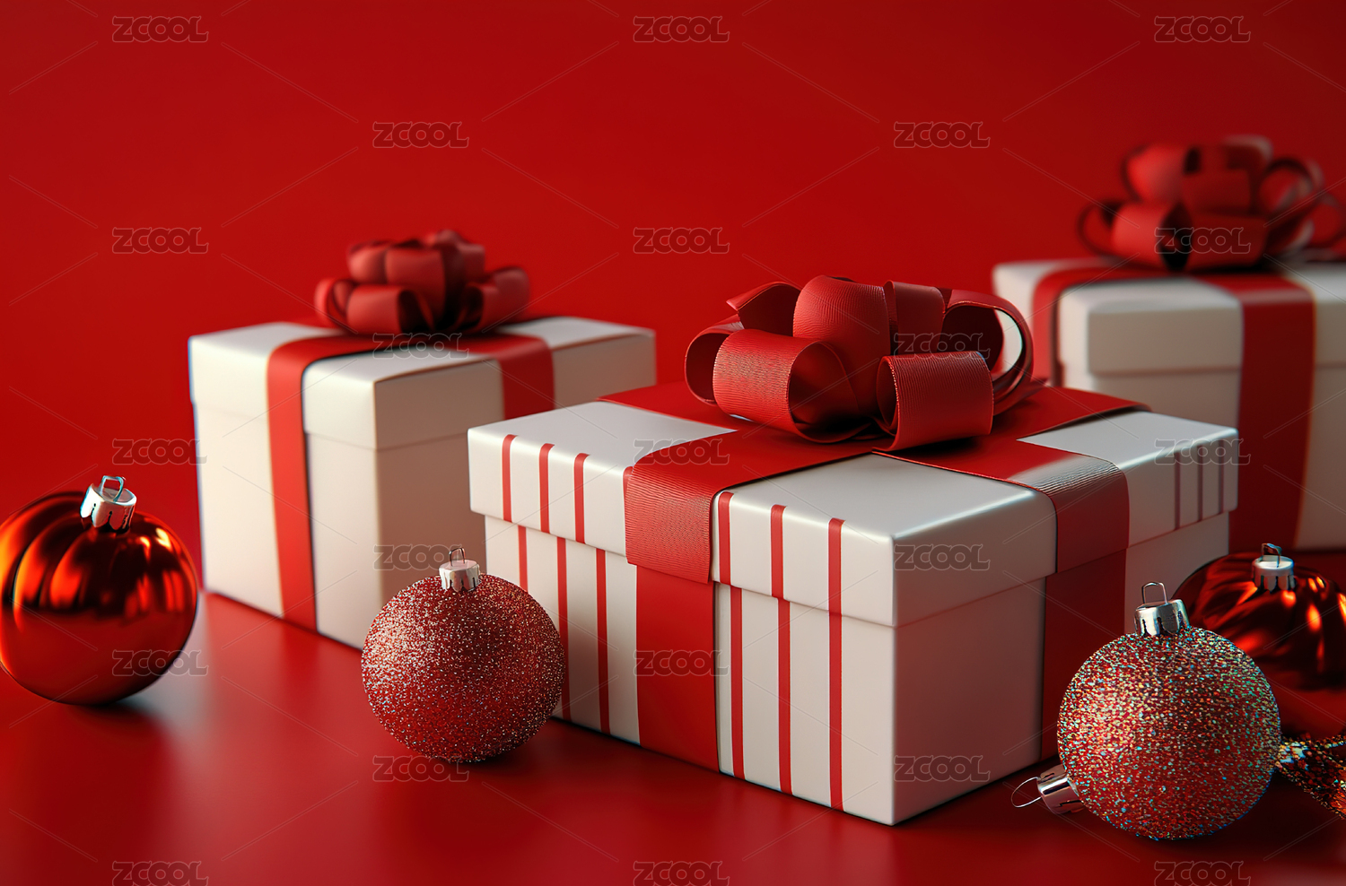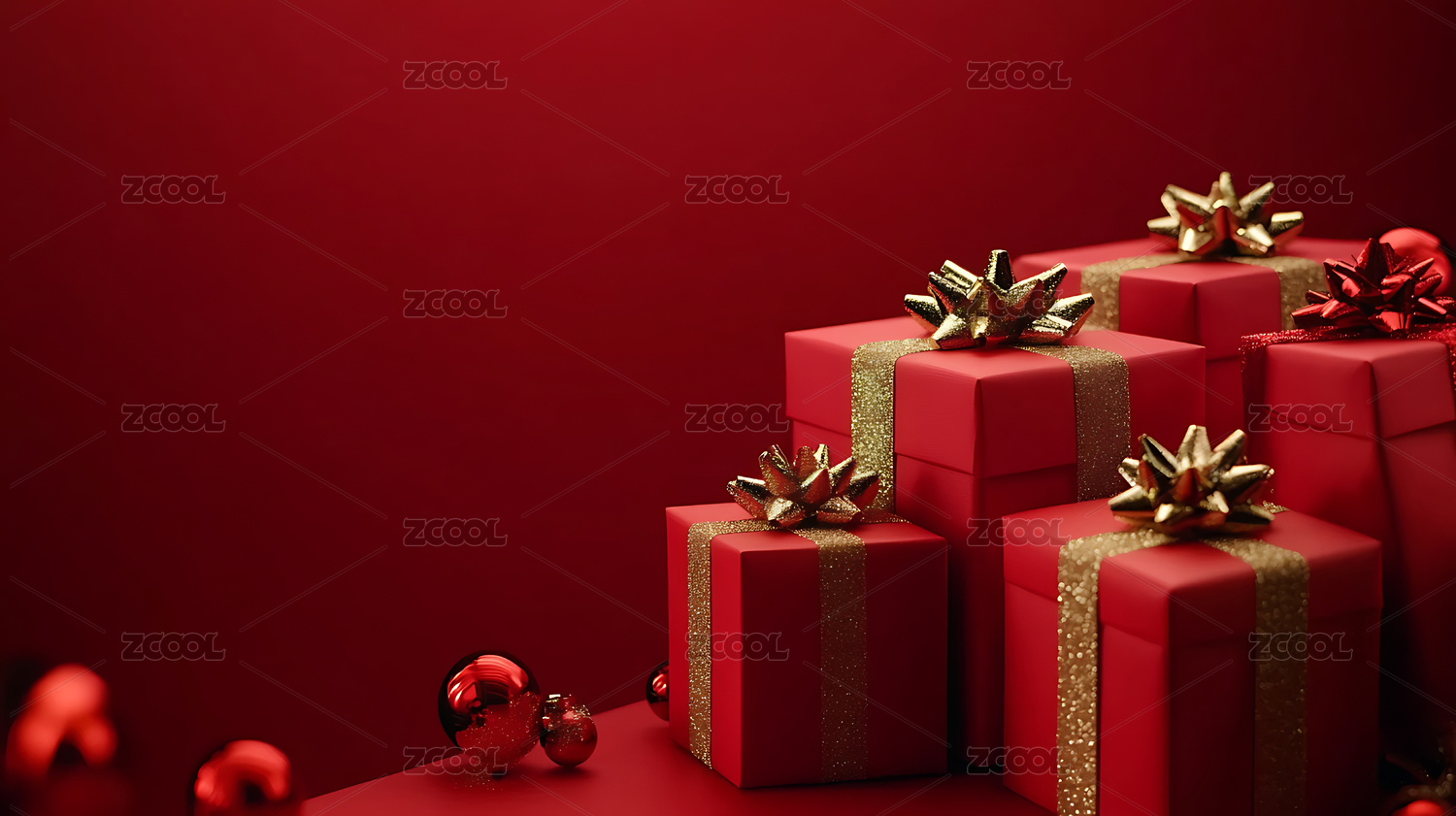 红色背景上礼盒和装饰彩球