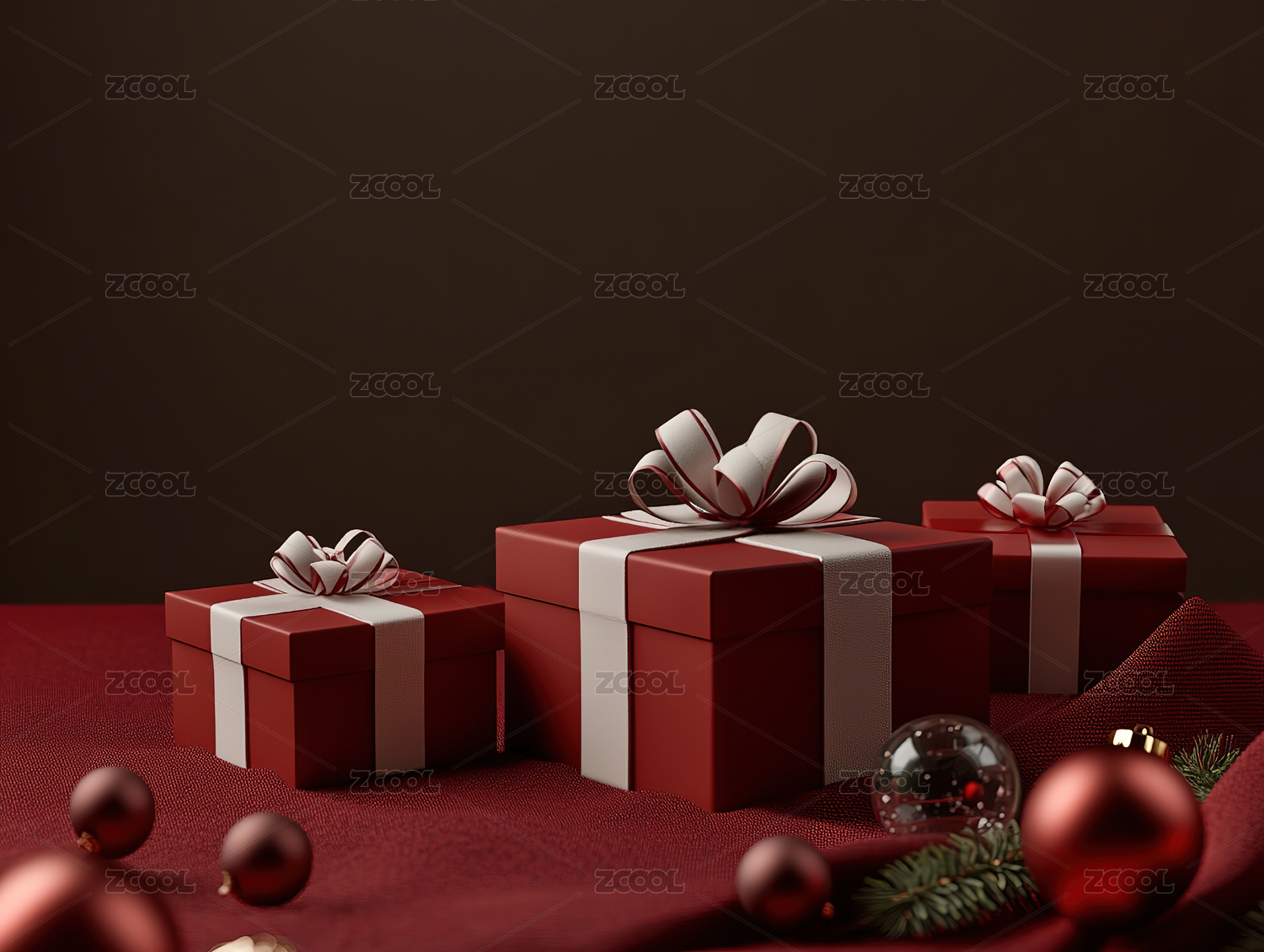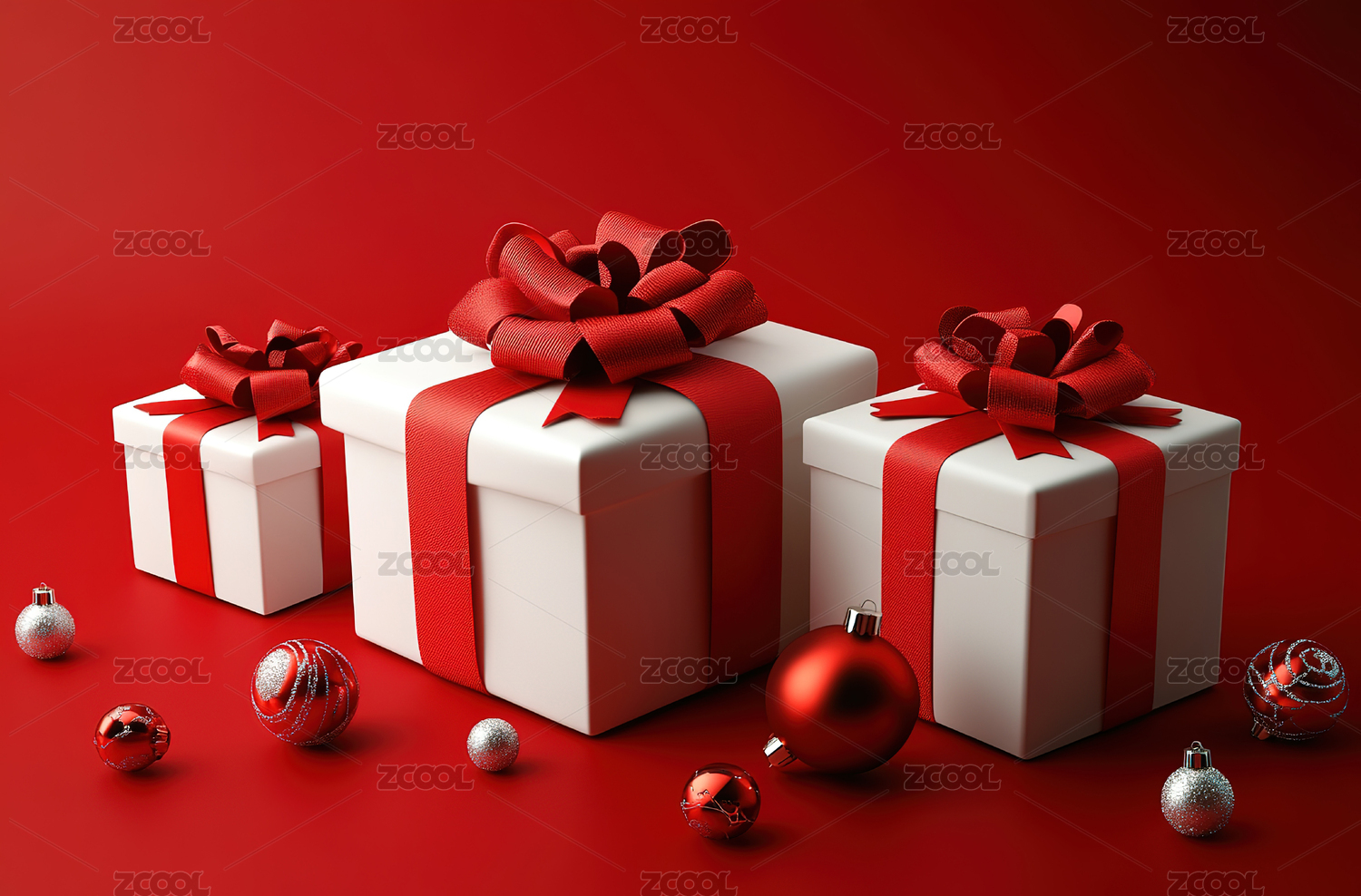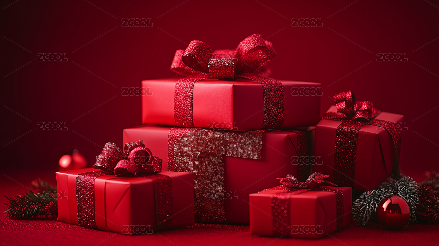 红色背景上礼盒和装饰彩球