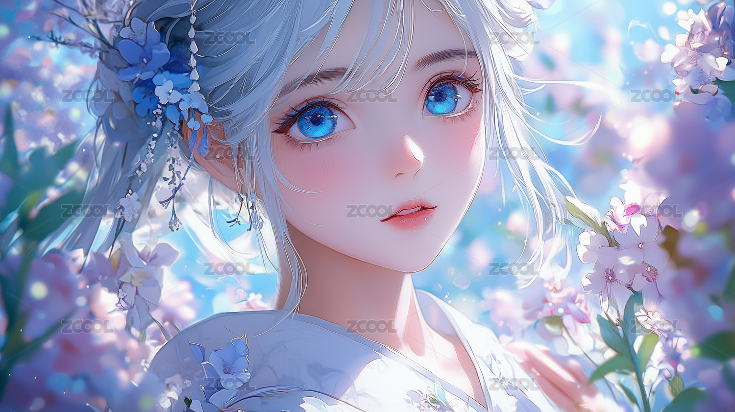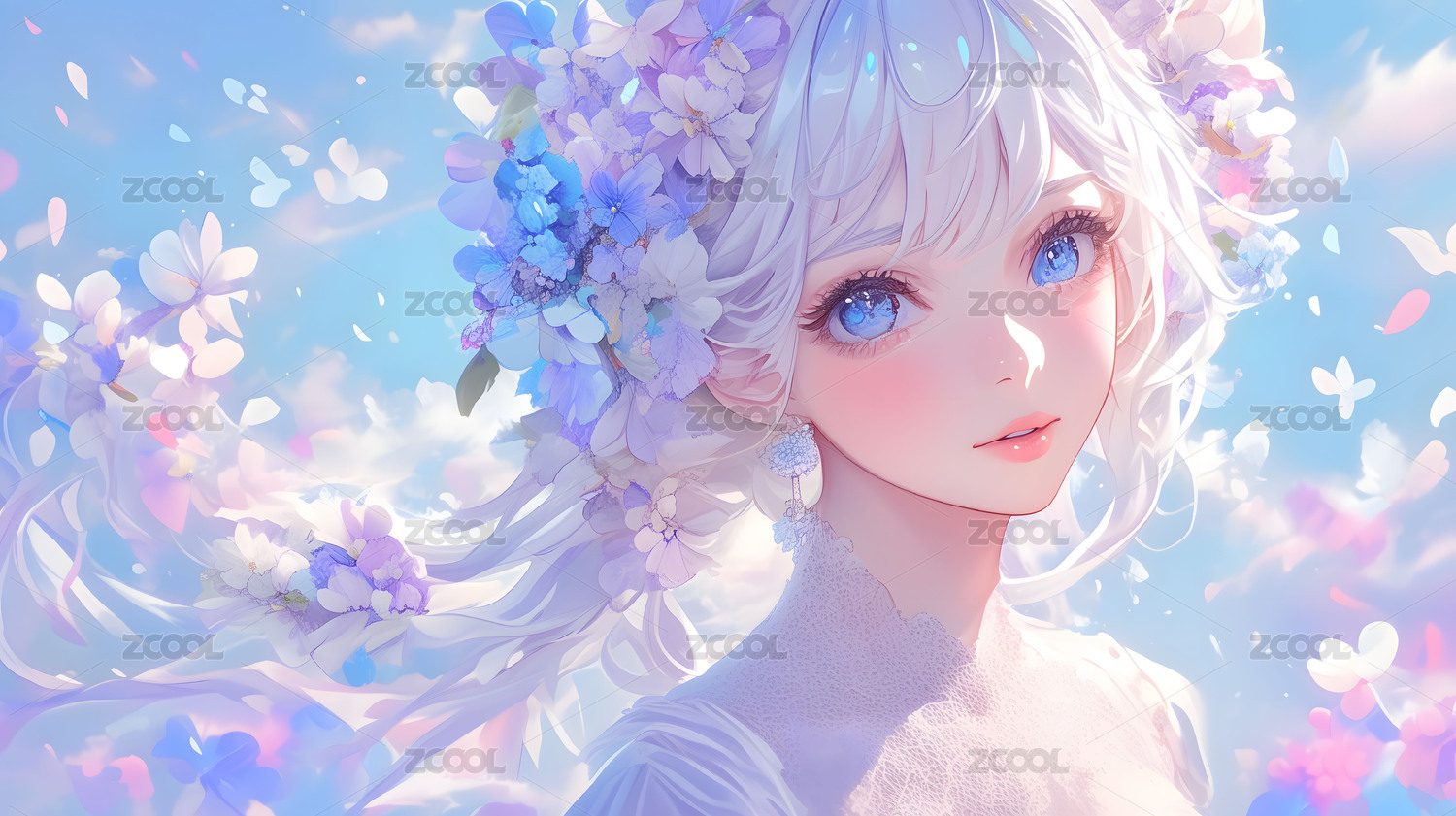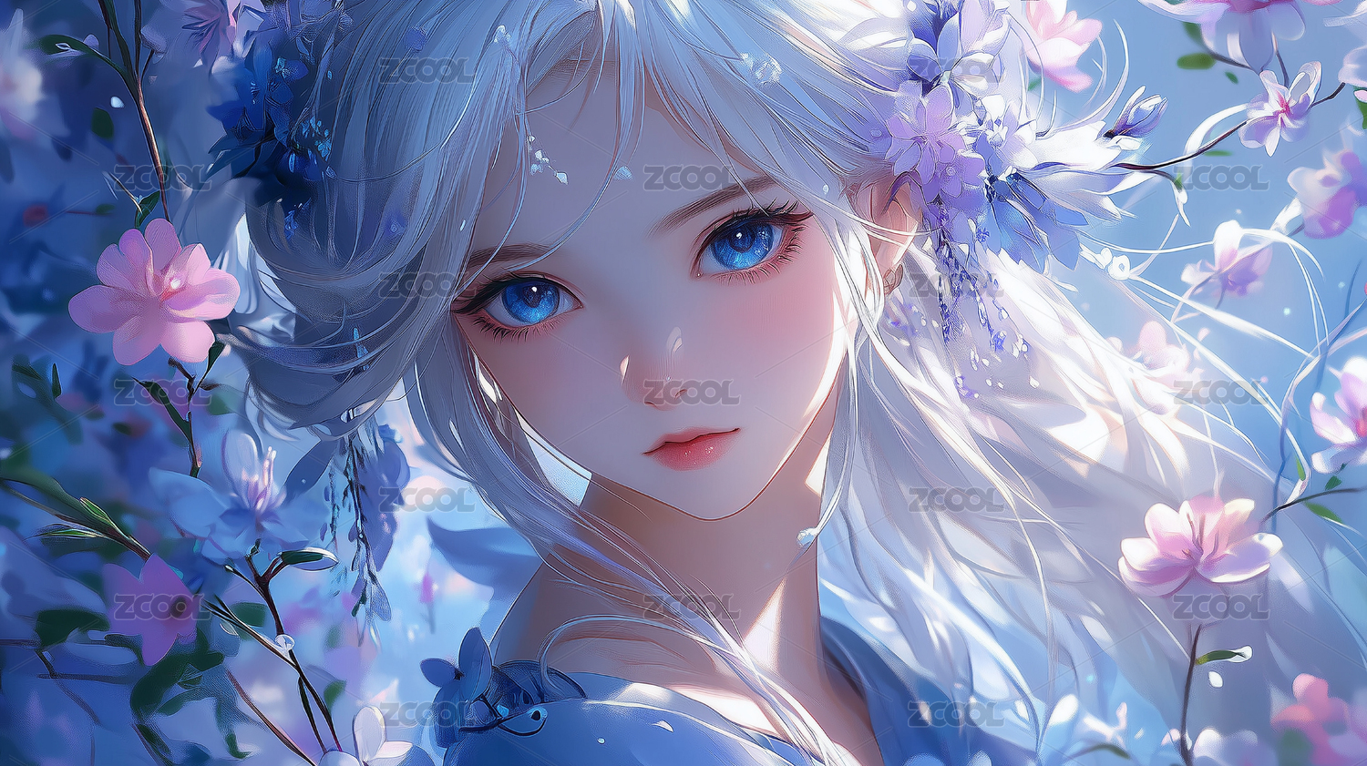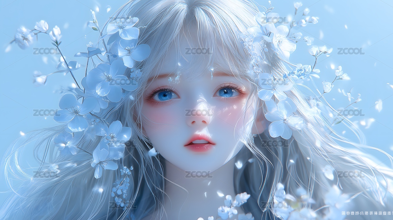 少女,雪白发丝花朵点缀,蓝色眼眸似梦幻