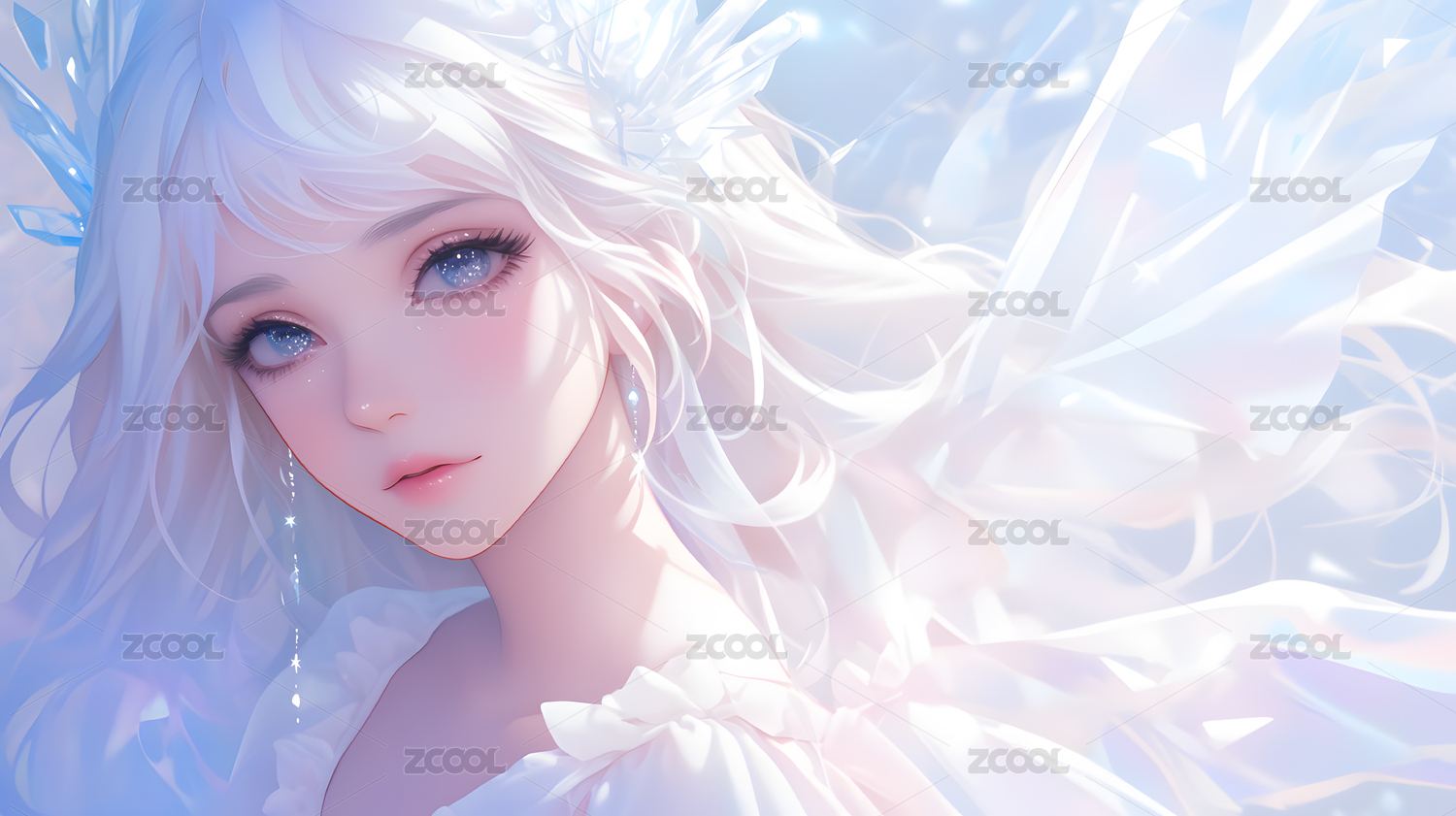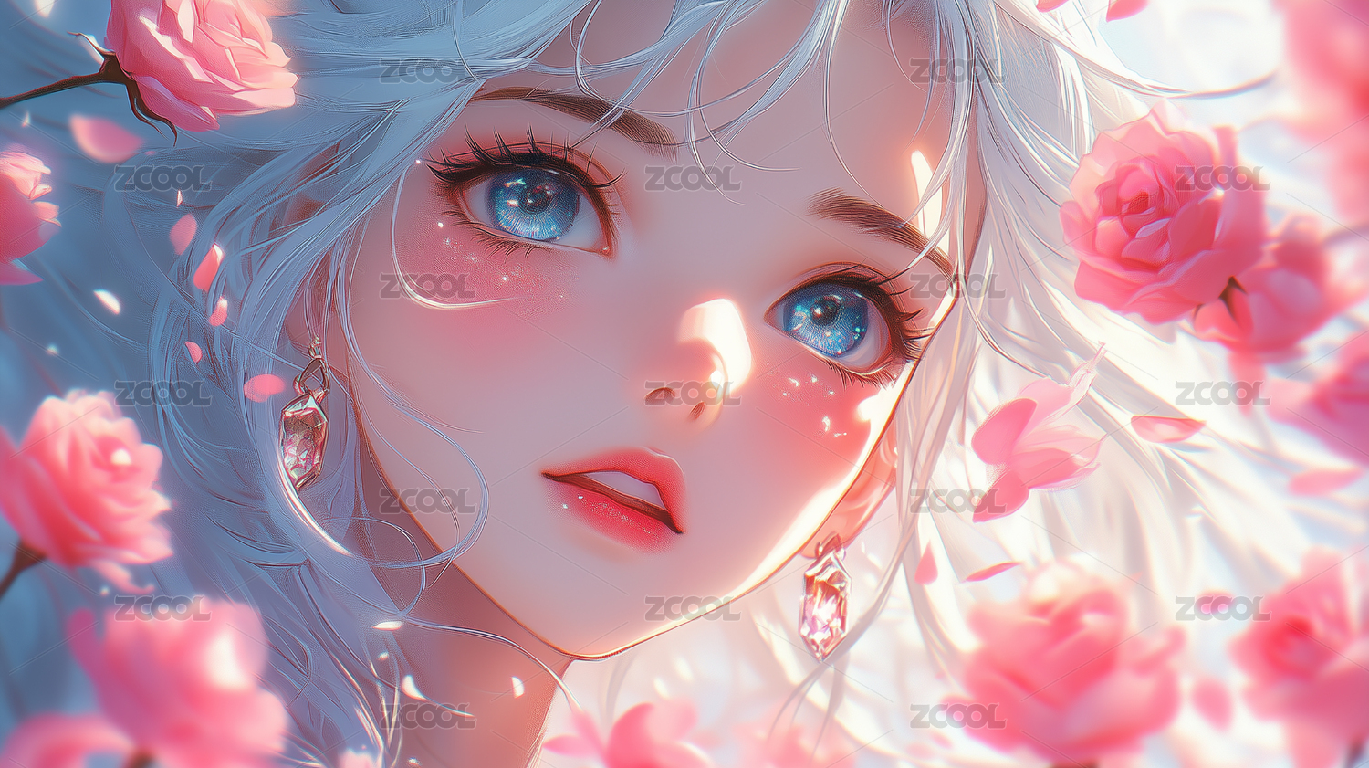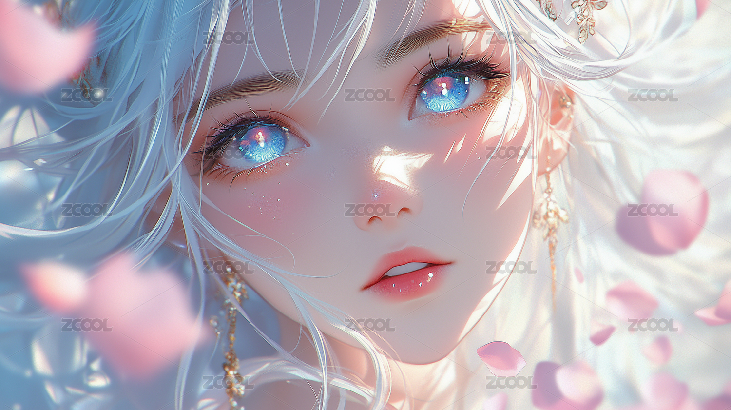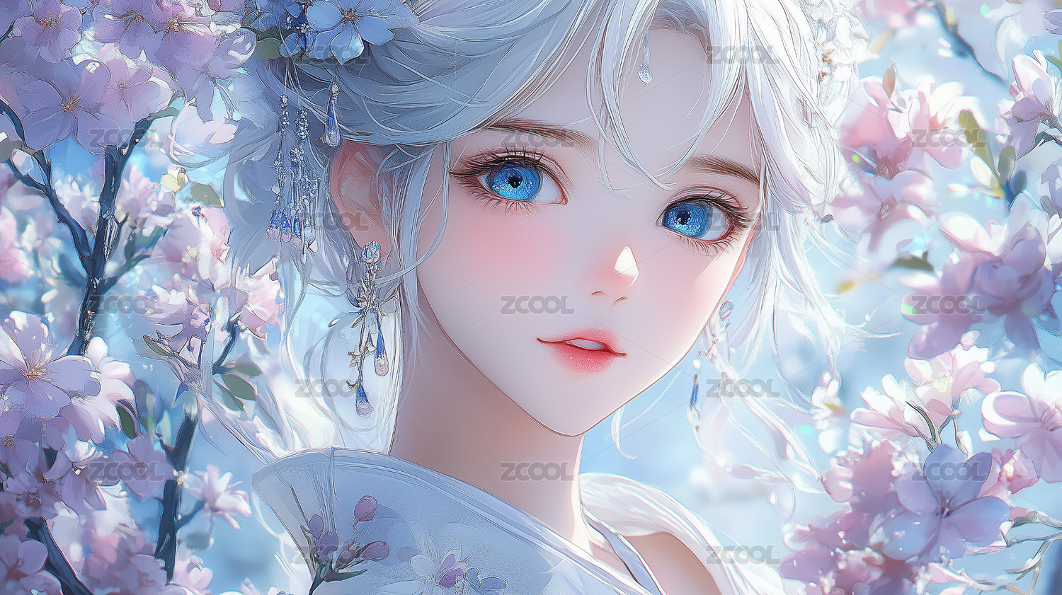 少女,雪白发丝花朵点缀,蓝色眼眸似梦幻