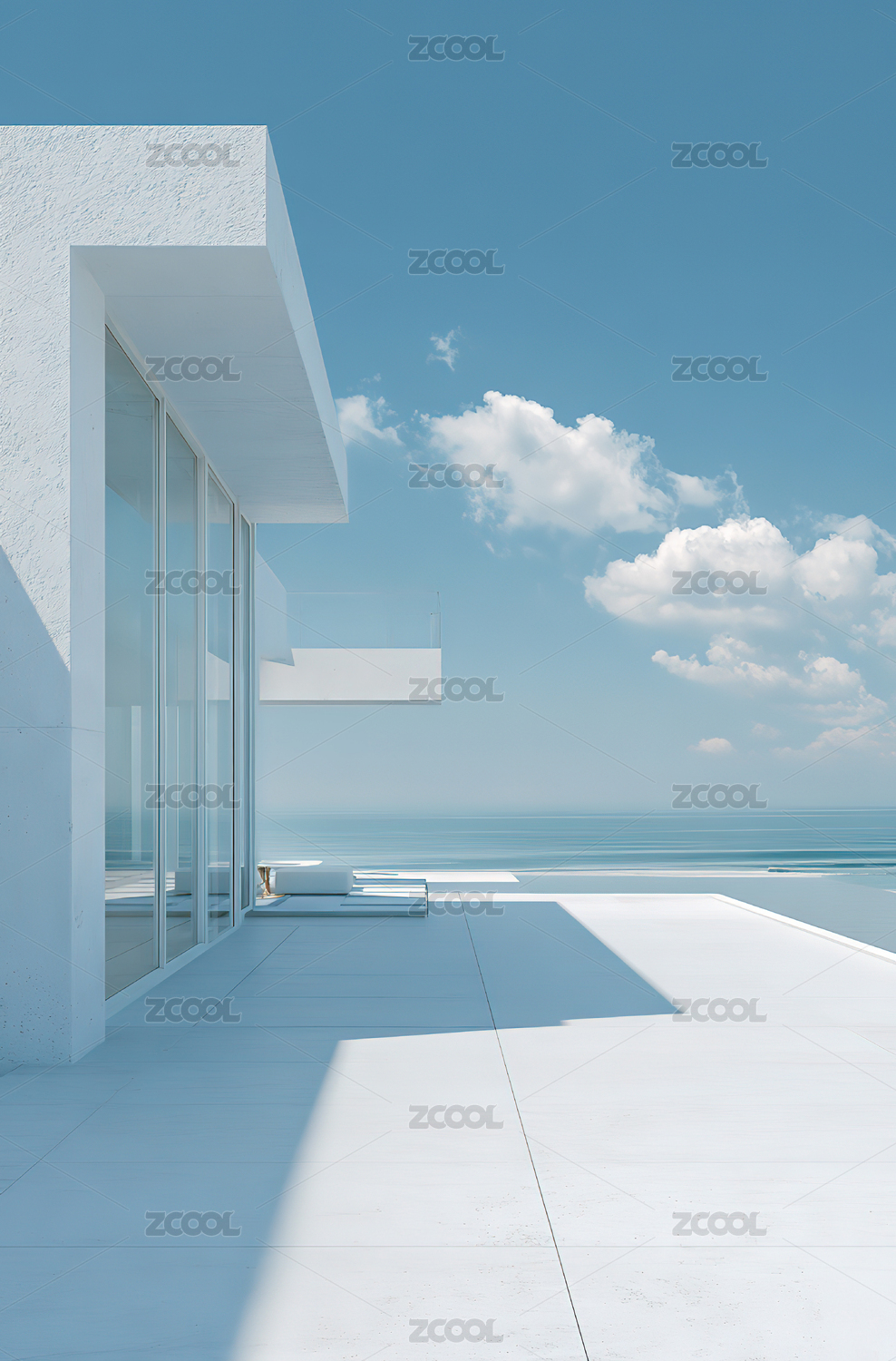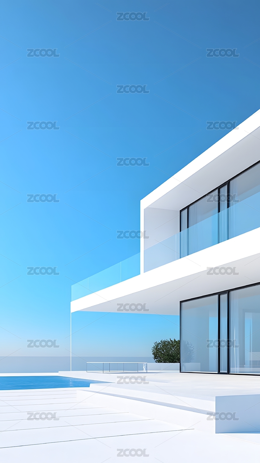 白天清新明亮现代单层别墅建筑局部插画绘画