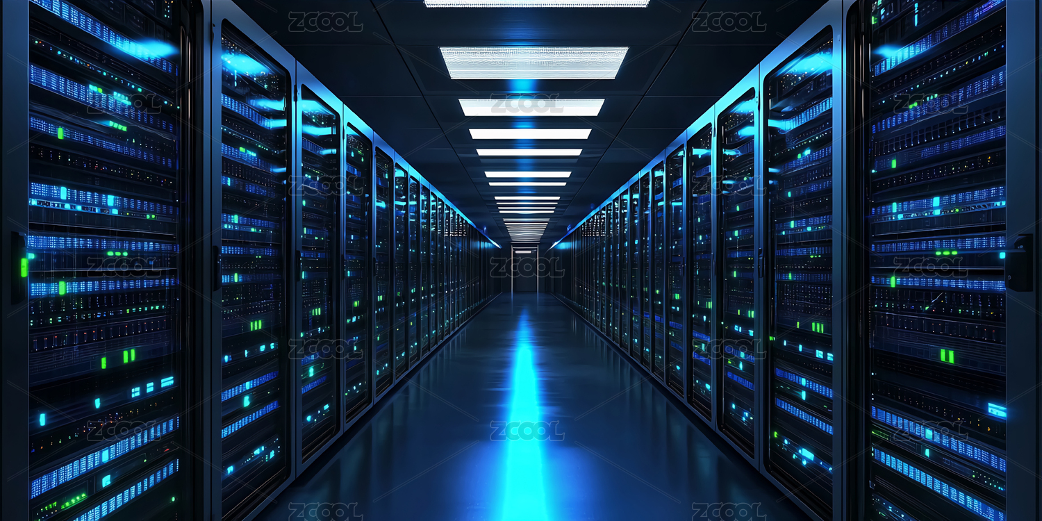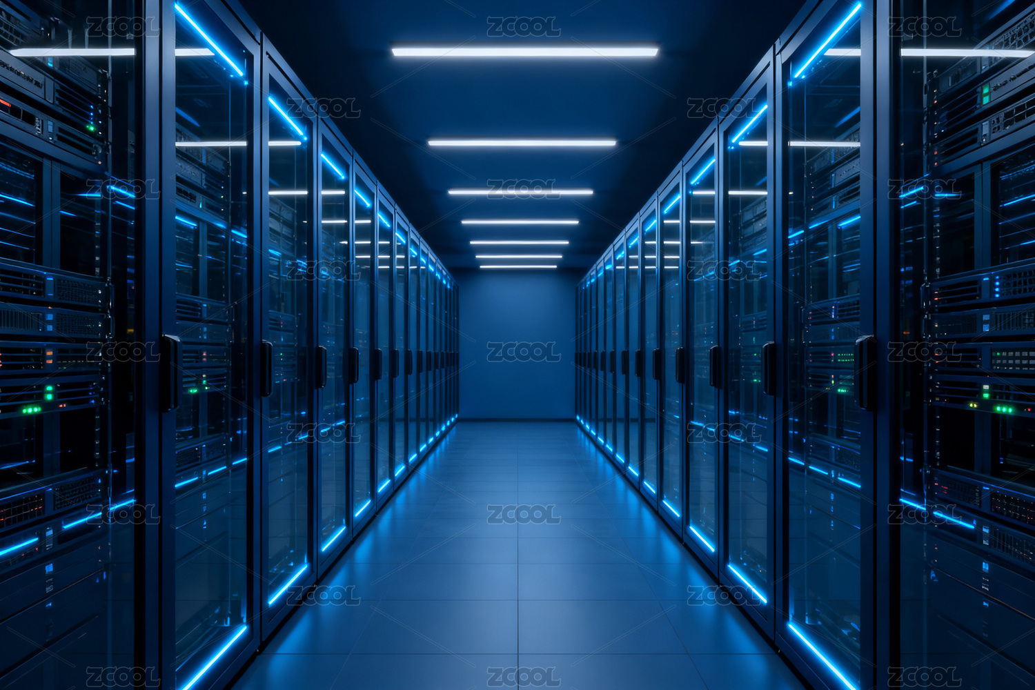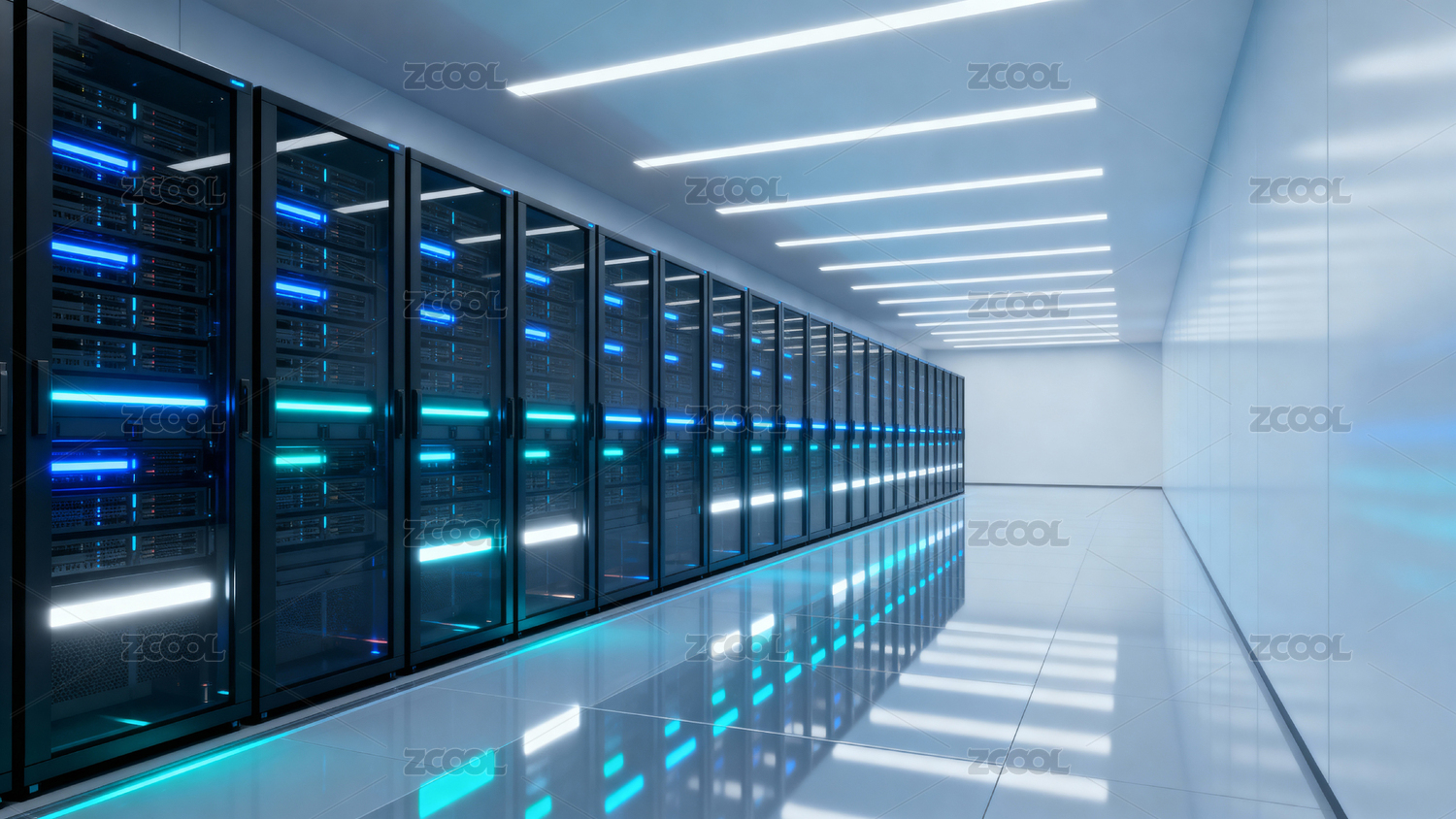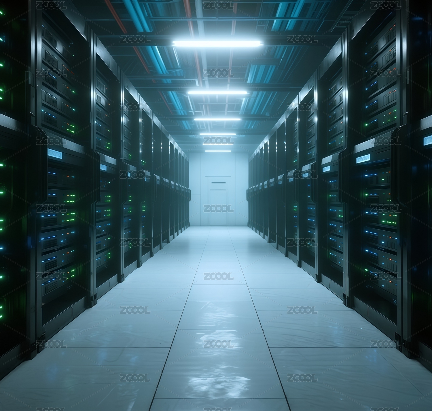 三维渲染的现代化高科技的服务器机房,强大的数据库和运算存储能力。