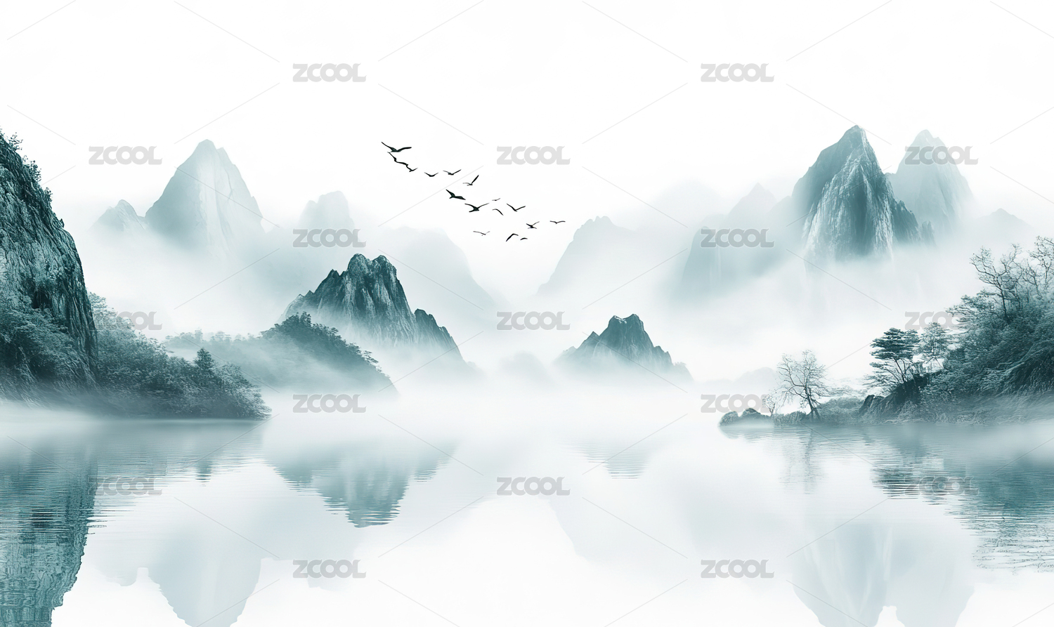 水墨画风格山峦湖泊风景