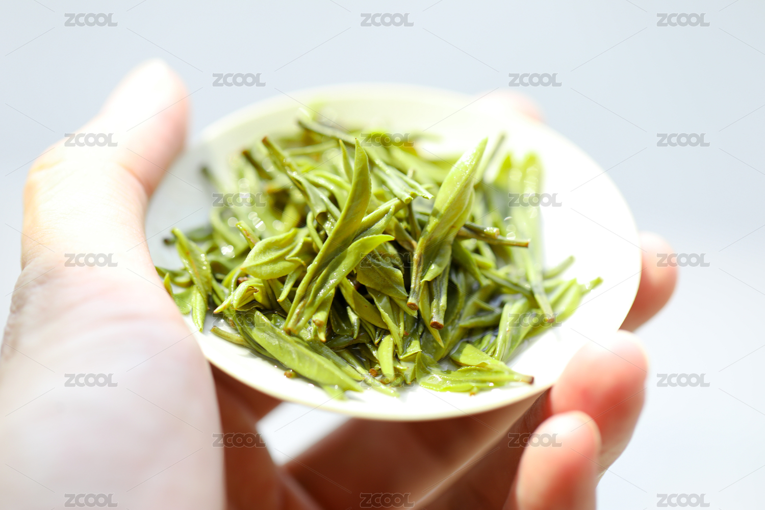 白瓷水墨茶则上装着嫩绿色的西湖龙井干茶