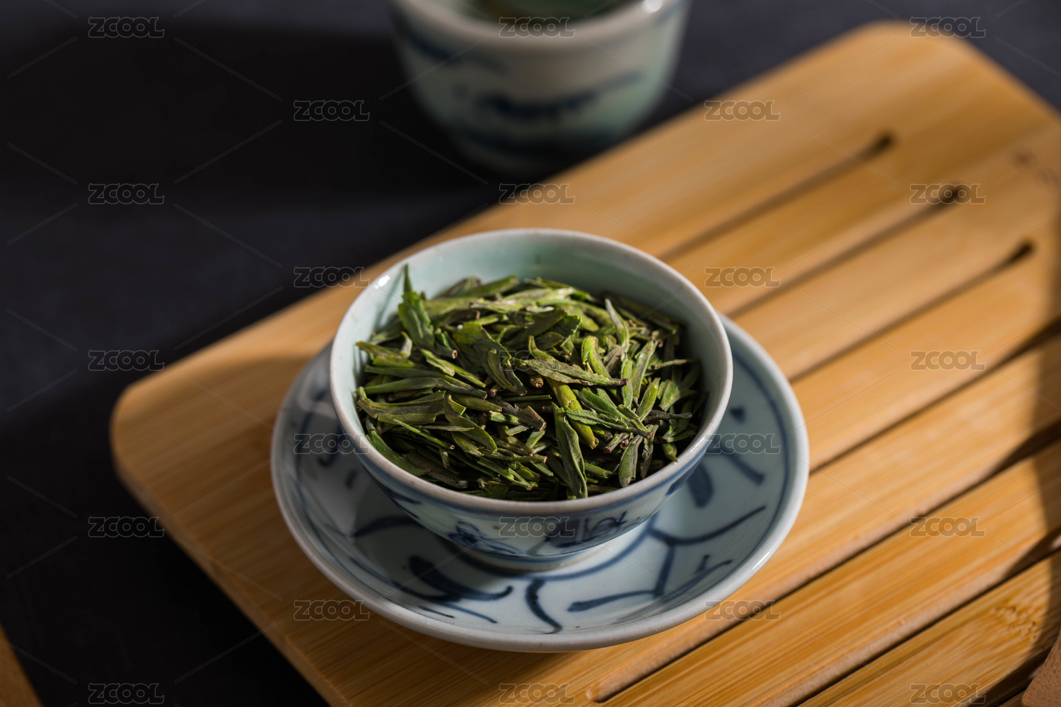 在重竹茶台上用白瓷小杯盛满信阳毛尖干茶近距离特写