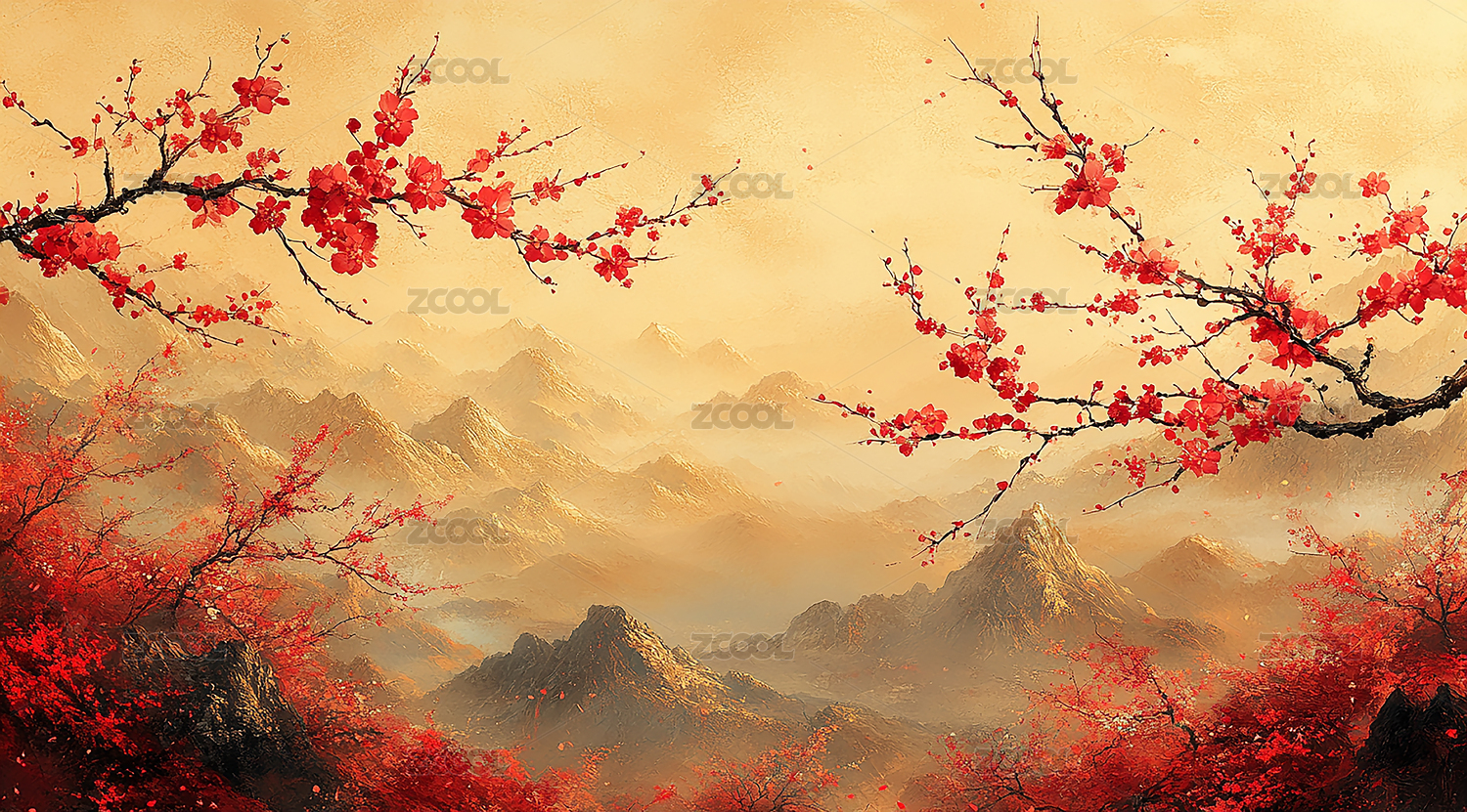 古风山水背景前的红梅梅花花枝