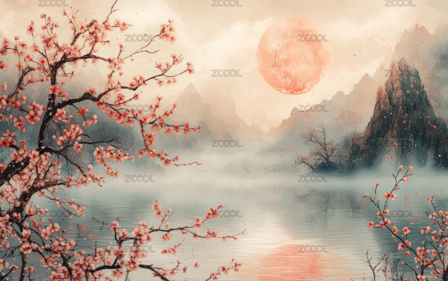 湖泊,自然,壁纸,背景,艺术,山水,水墨画,樱花,日式,风景画