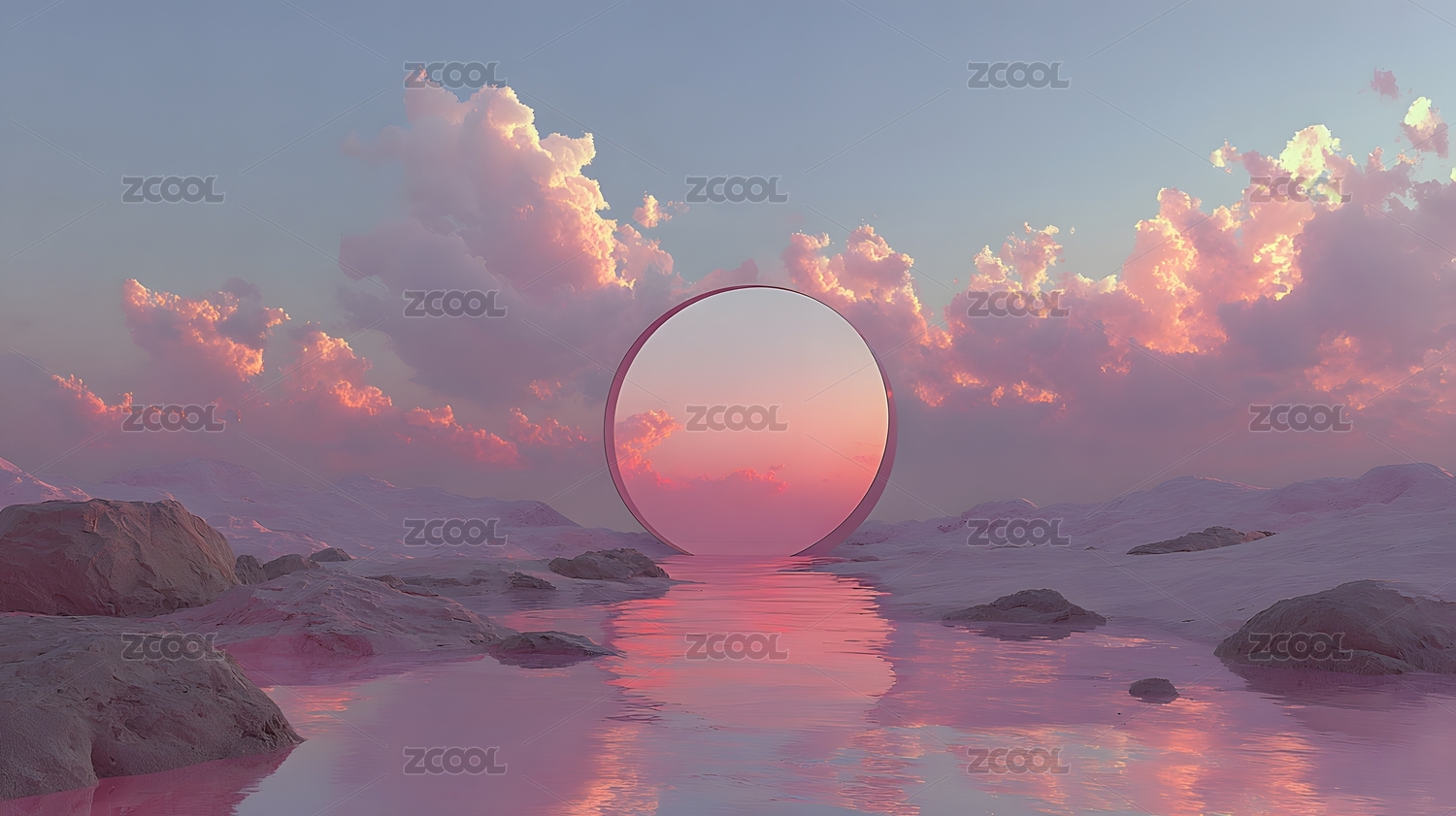 3D抽象空间设计 粉紫色沙漠镜子山脉场景