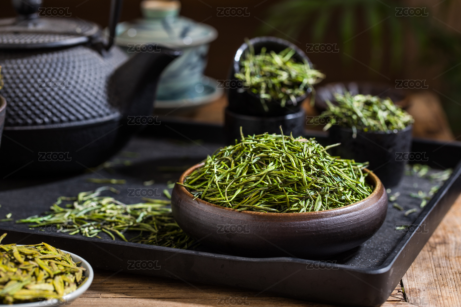 装在黑色碗里的中国茗茶竹叶青干茶叶