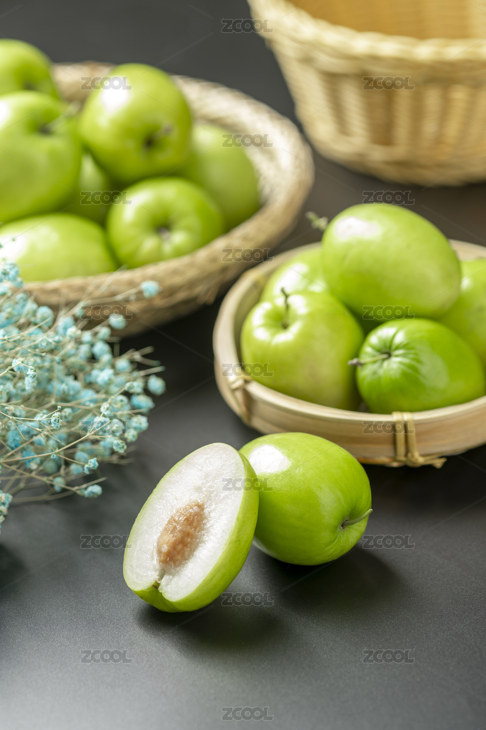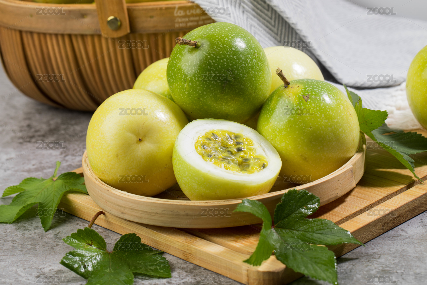 青底上的百香果特写及一竹篮的百香果