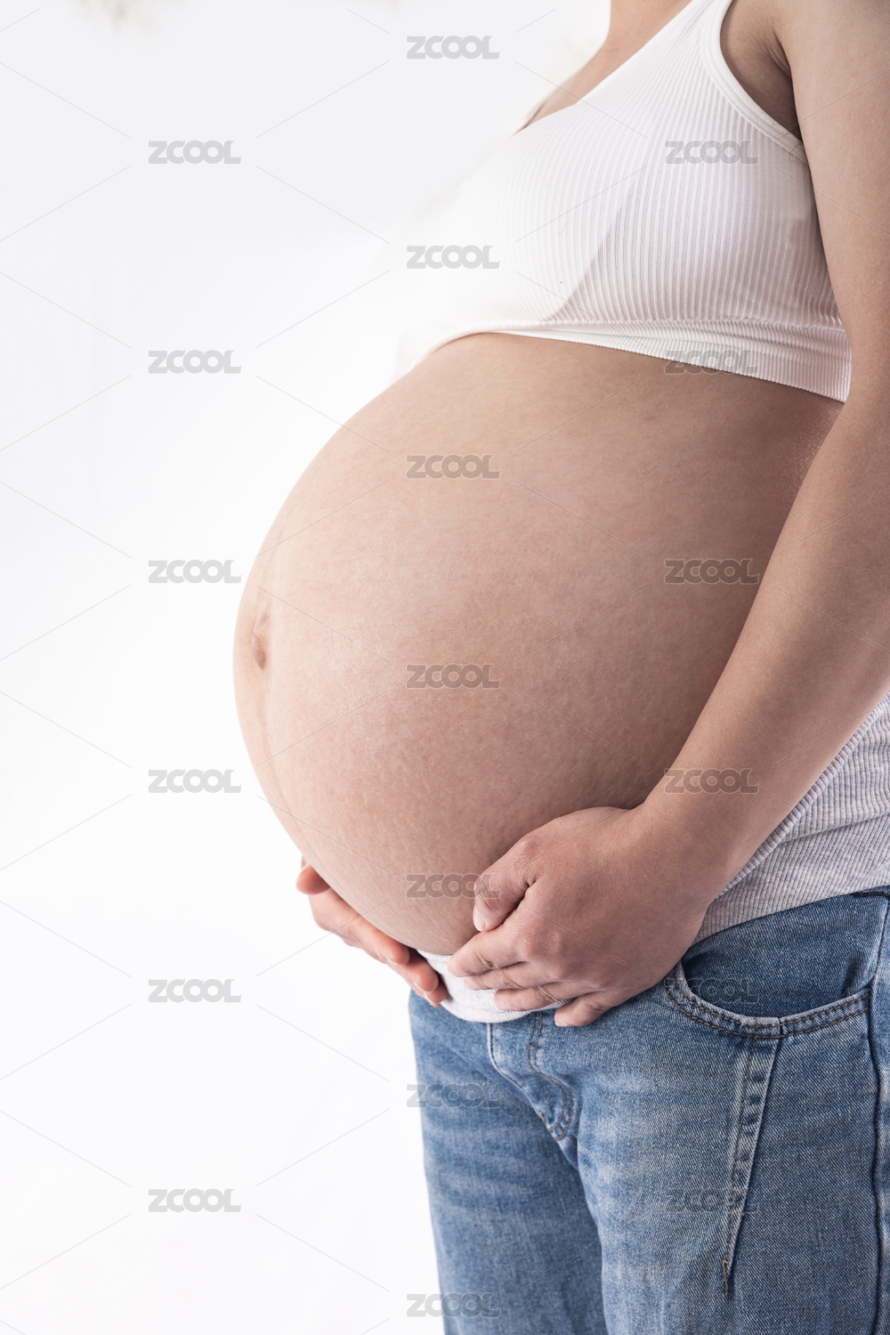 白色背景前孕妇挺着鼓鼓的大肚子用双手托住