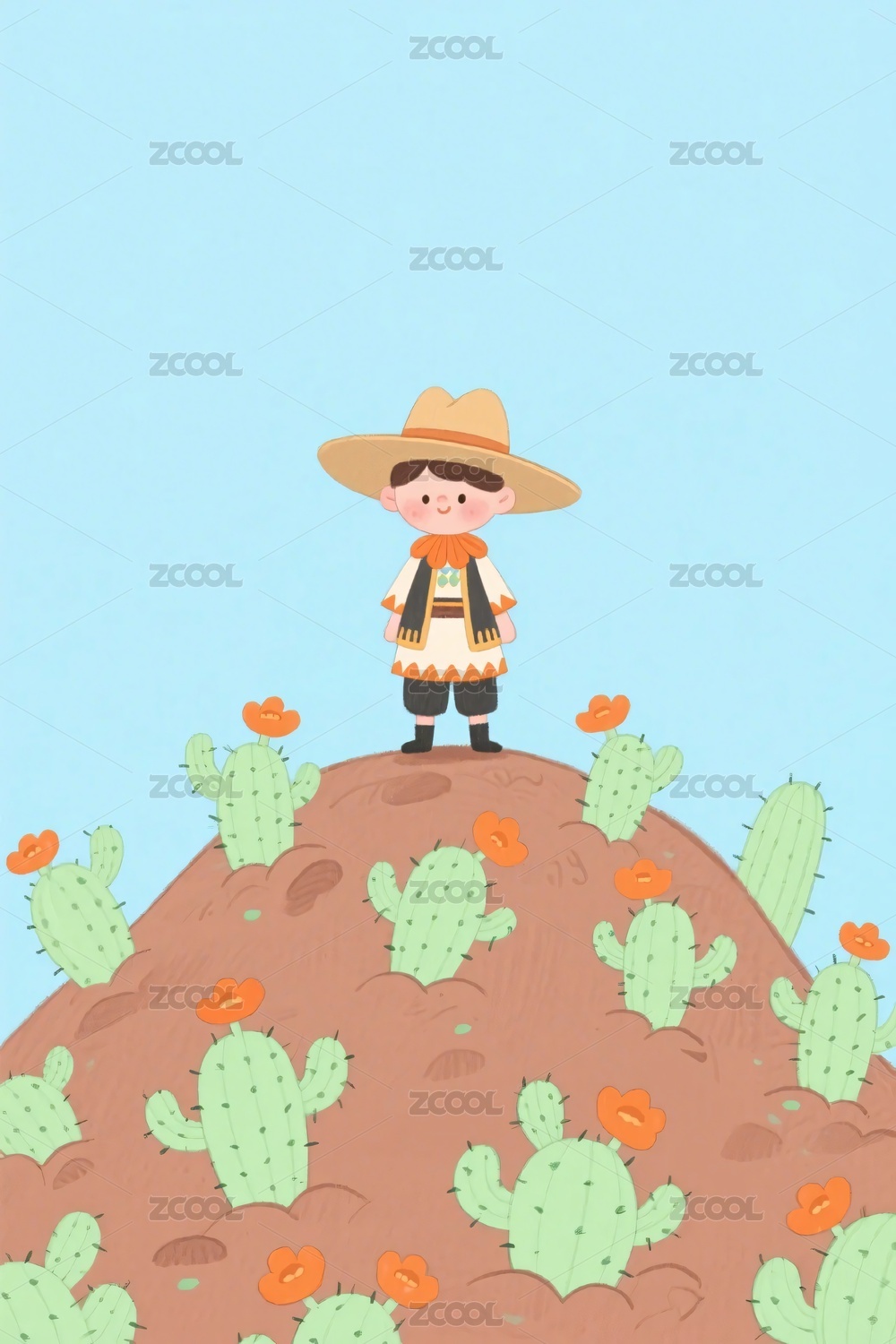 卡通小孩与仙人掌小山