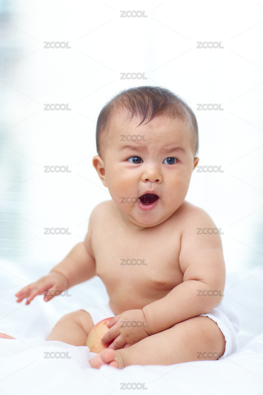 四个月宝宝在白色背景里趴着玩耍