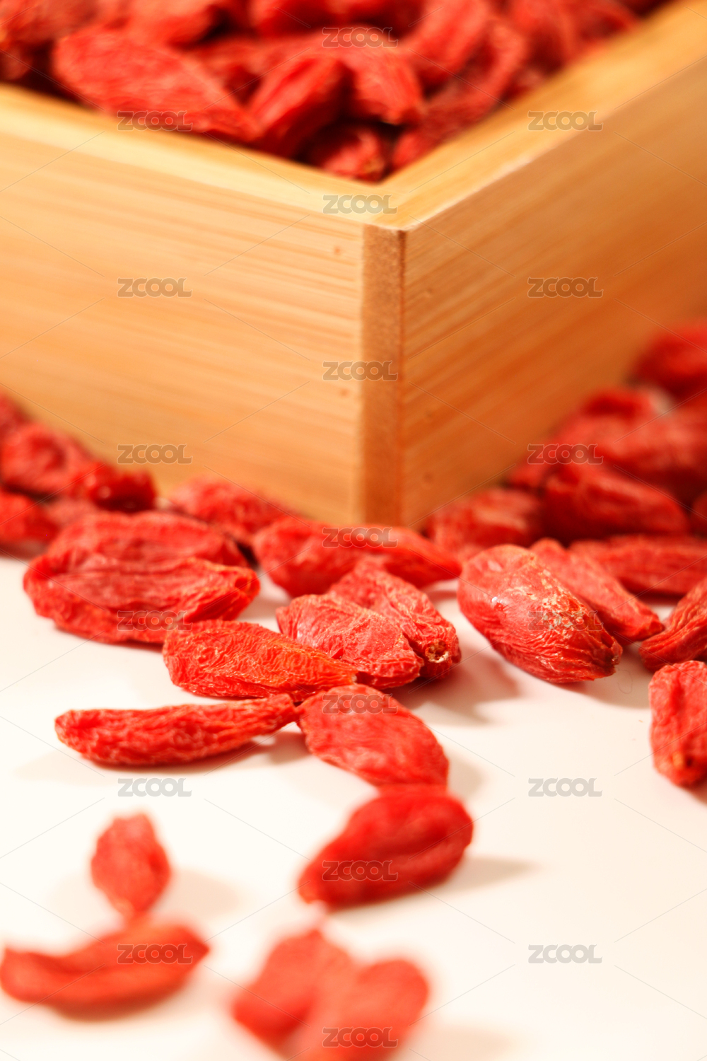 白底上木制容器里装着枸杞