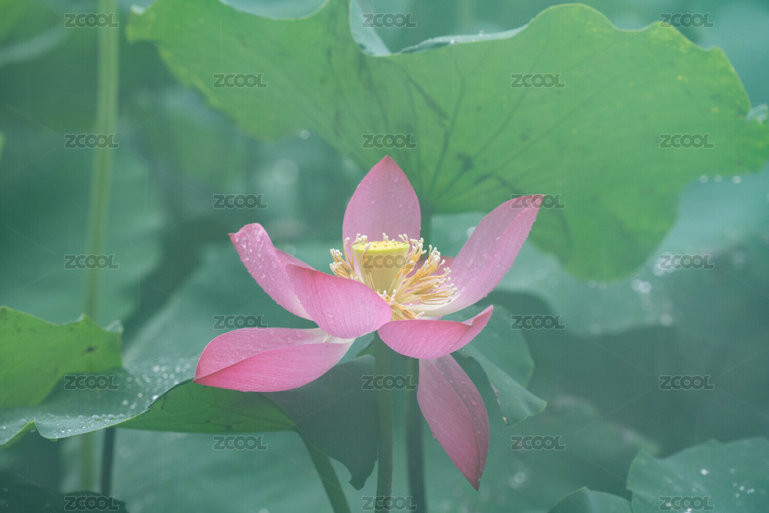 水雾蒙蒙的荷塘里粉色荷花绽放