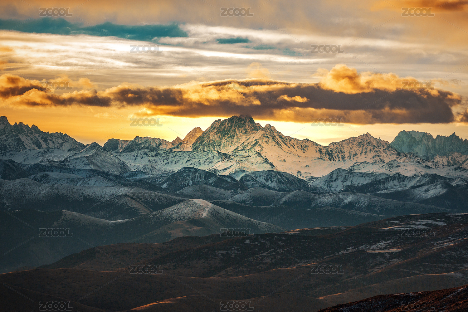 中国四川甘孜高尔寺山黑石城眺望贡嘎群山