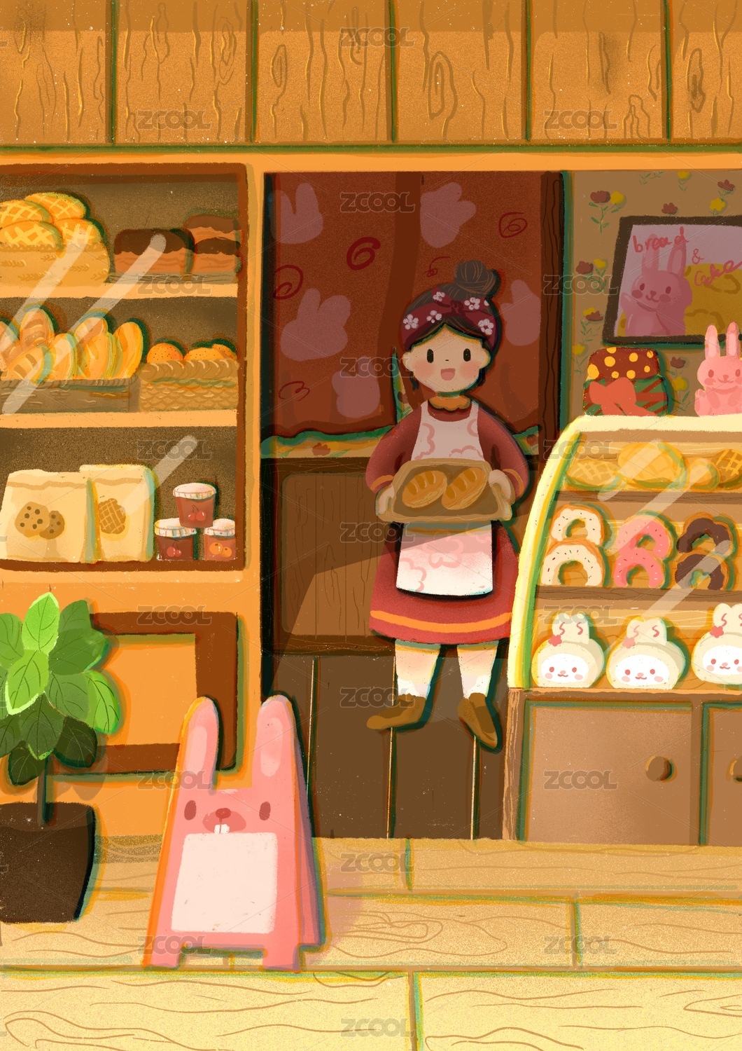 劳动节,插画,国风,面包,甜甜圈,烘培,厨房,食物,面点,女孩