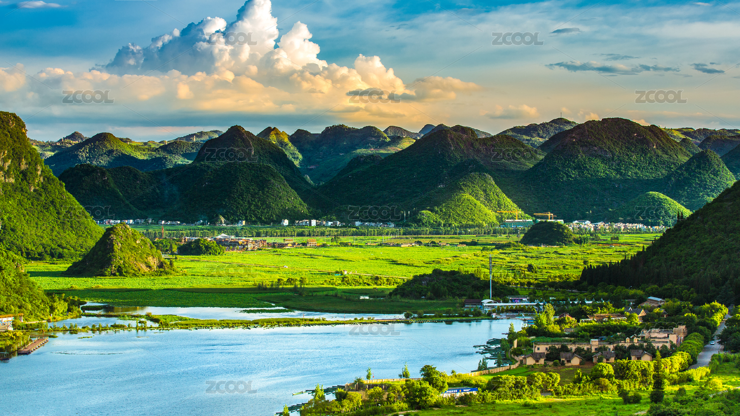 云南,普着黑,风光,山峰,湖水,农庄,田园