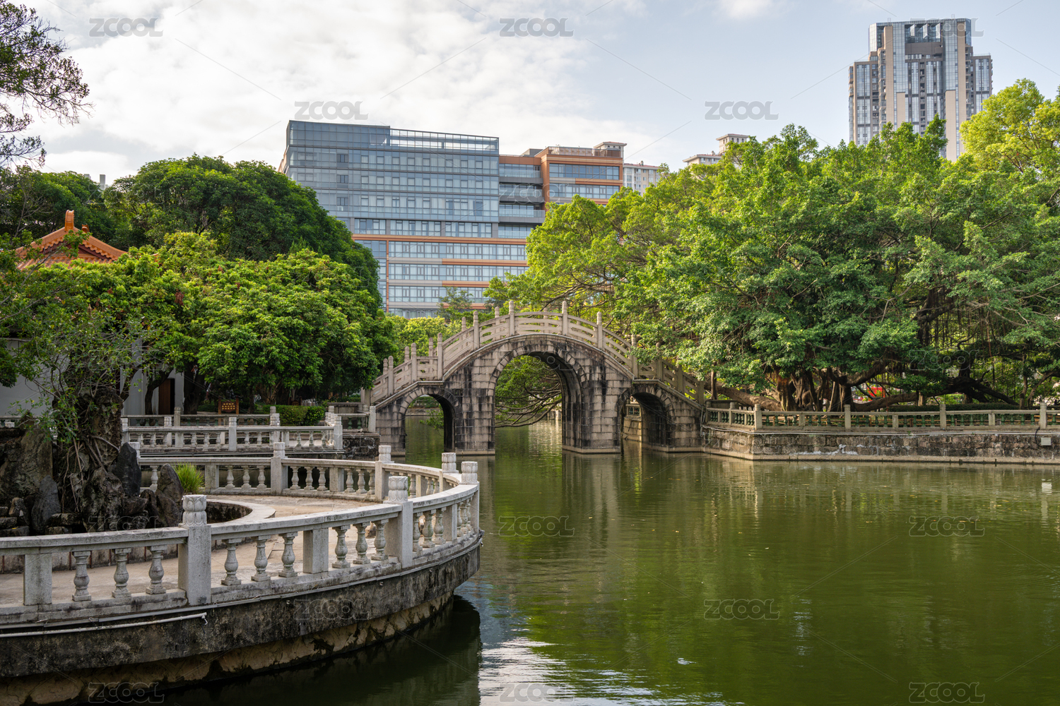 广西南宁狮山公园湖泊树林与竹影楼风雨桥