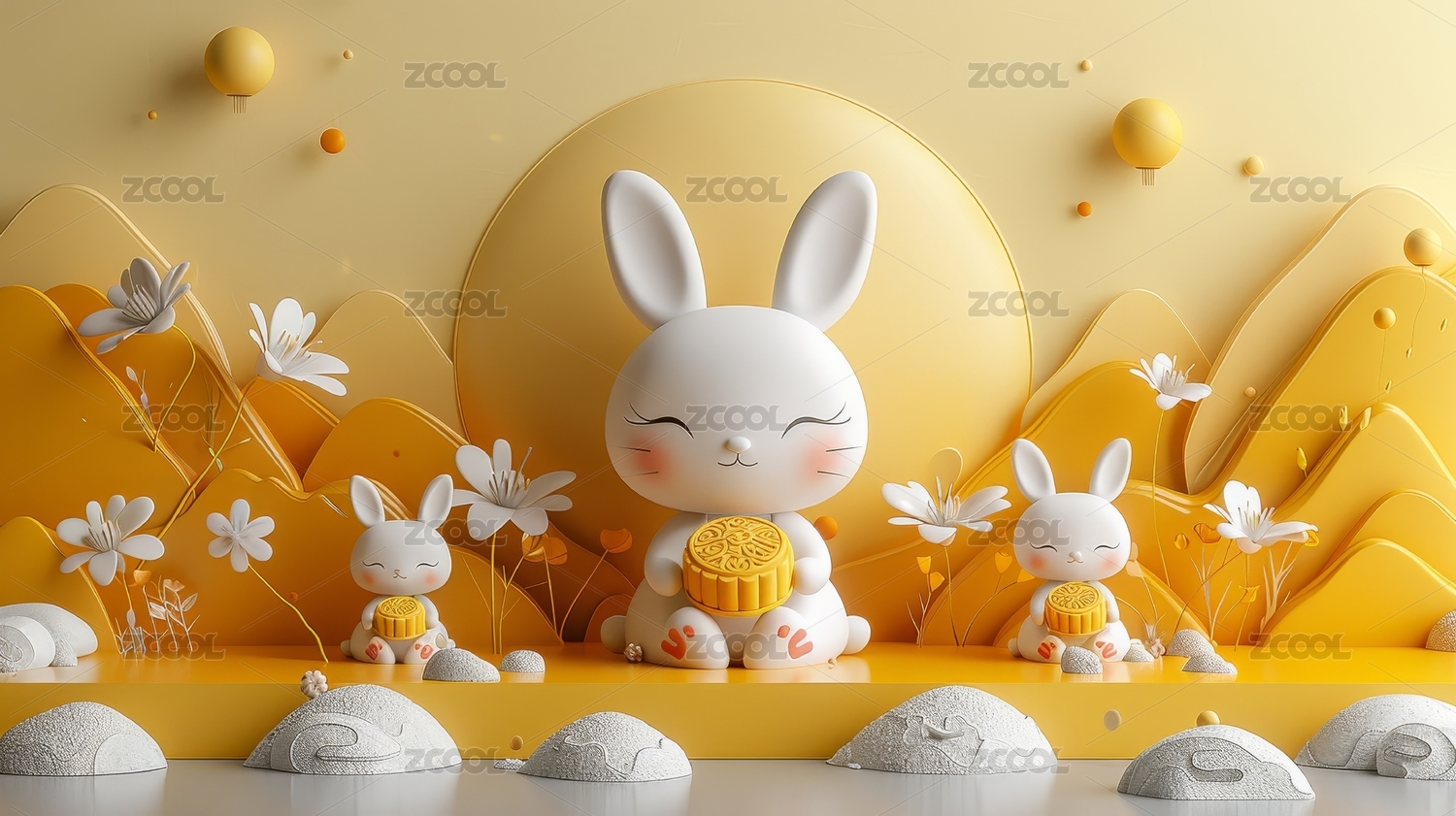 可爱兔子手捧月饼的3D插画