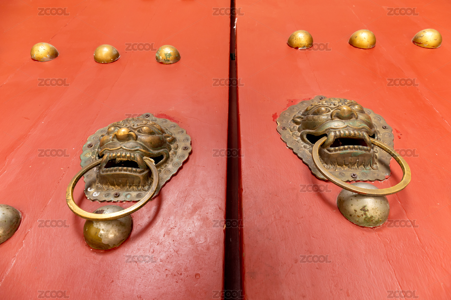 红色木门上的金属兽头门钹