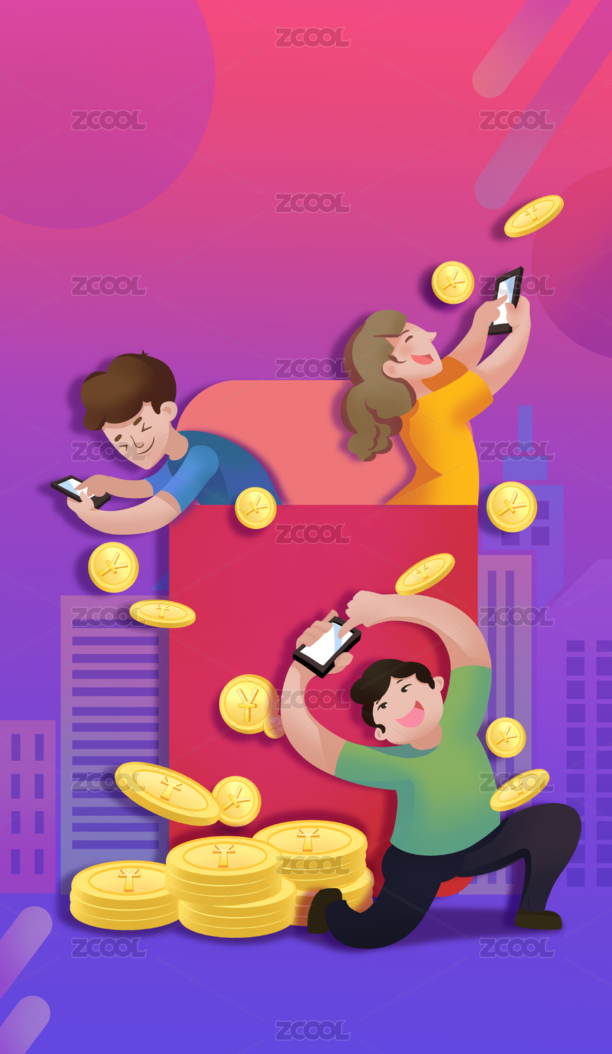 卡通手绘男人女人手机购物红包推广活动金融插画