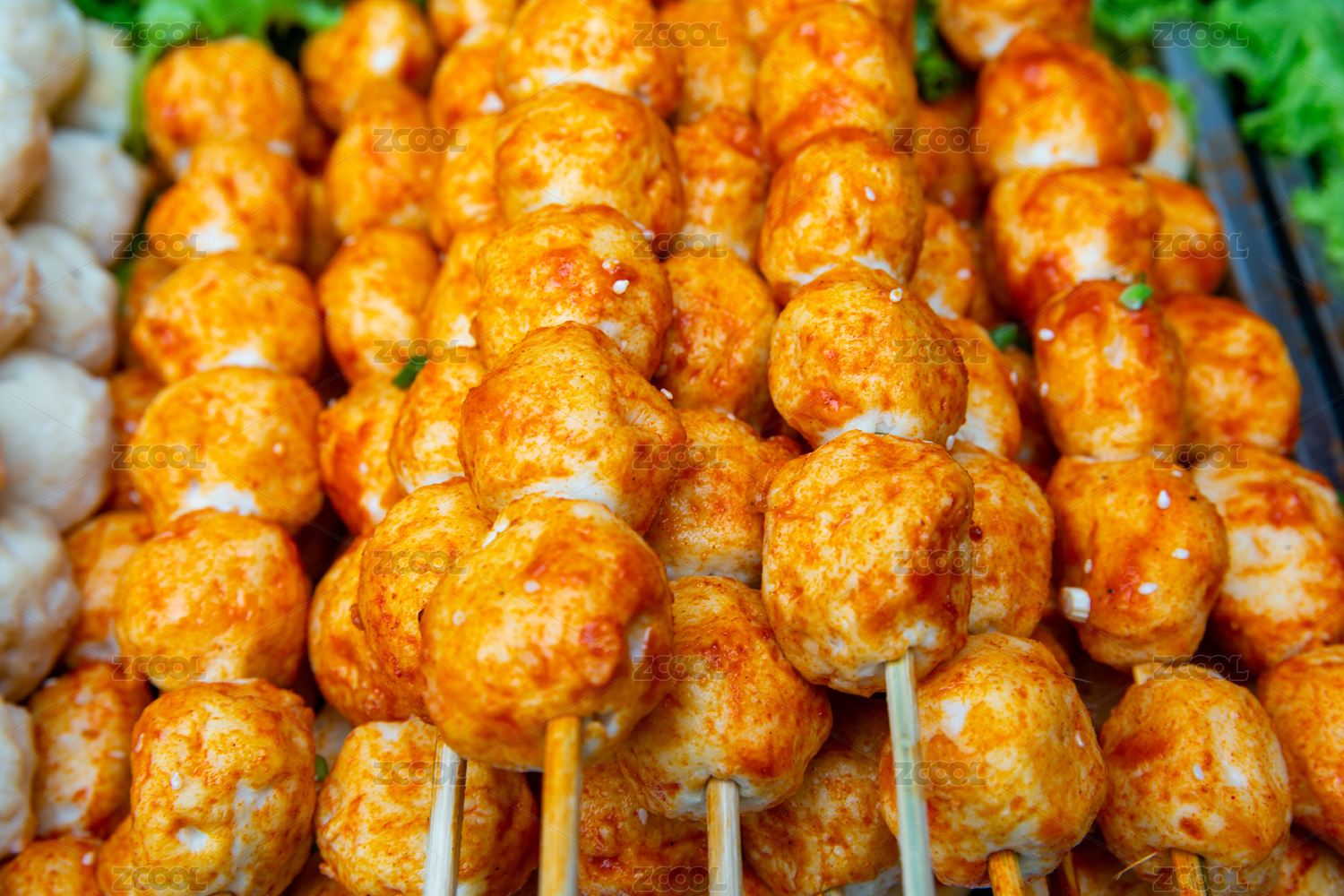 山东省青岛市劈柴院美食街的烤鱼丸串
