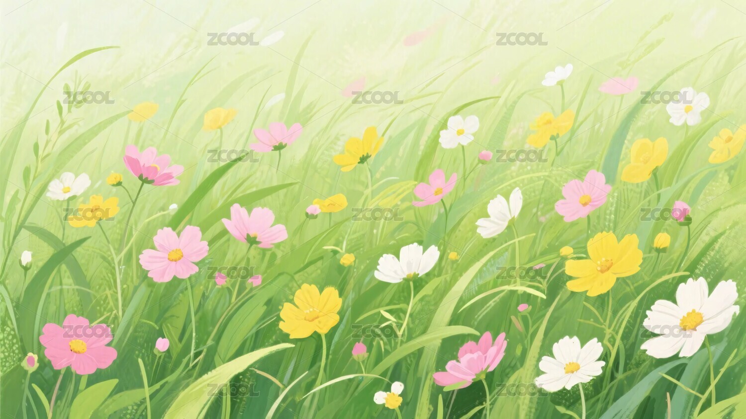 春日草地与繁花插画风景