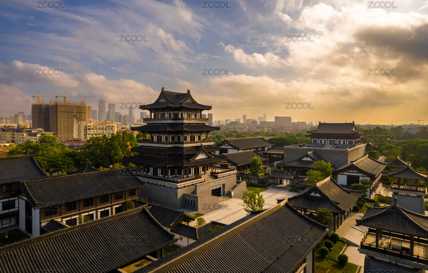 广州市文化馆中式传统岭南建筑与夕阳
