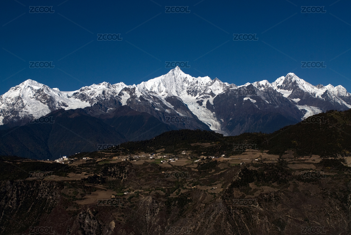 中国云南梅里雪山卡瓦格博峰和山下的村庄