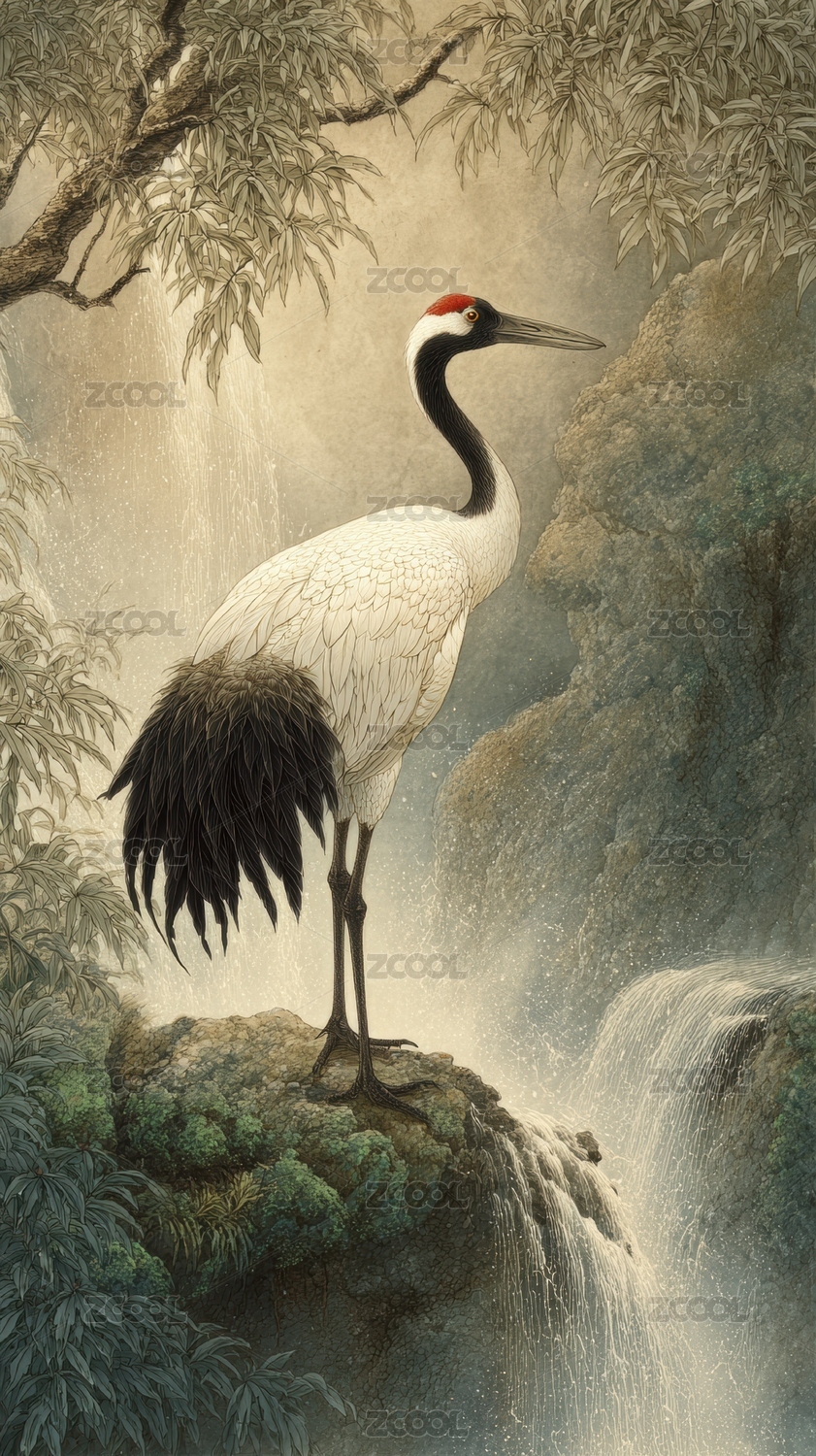 白鹤立于山涧溪流旁