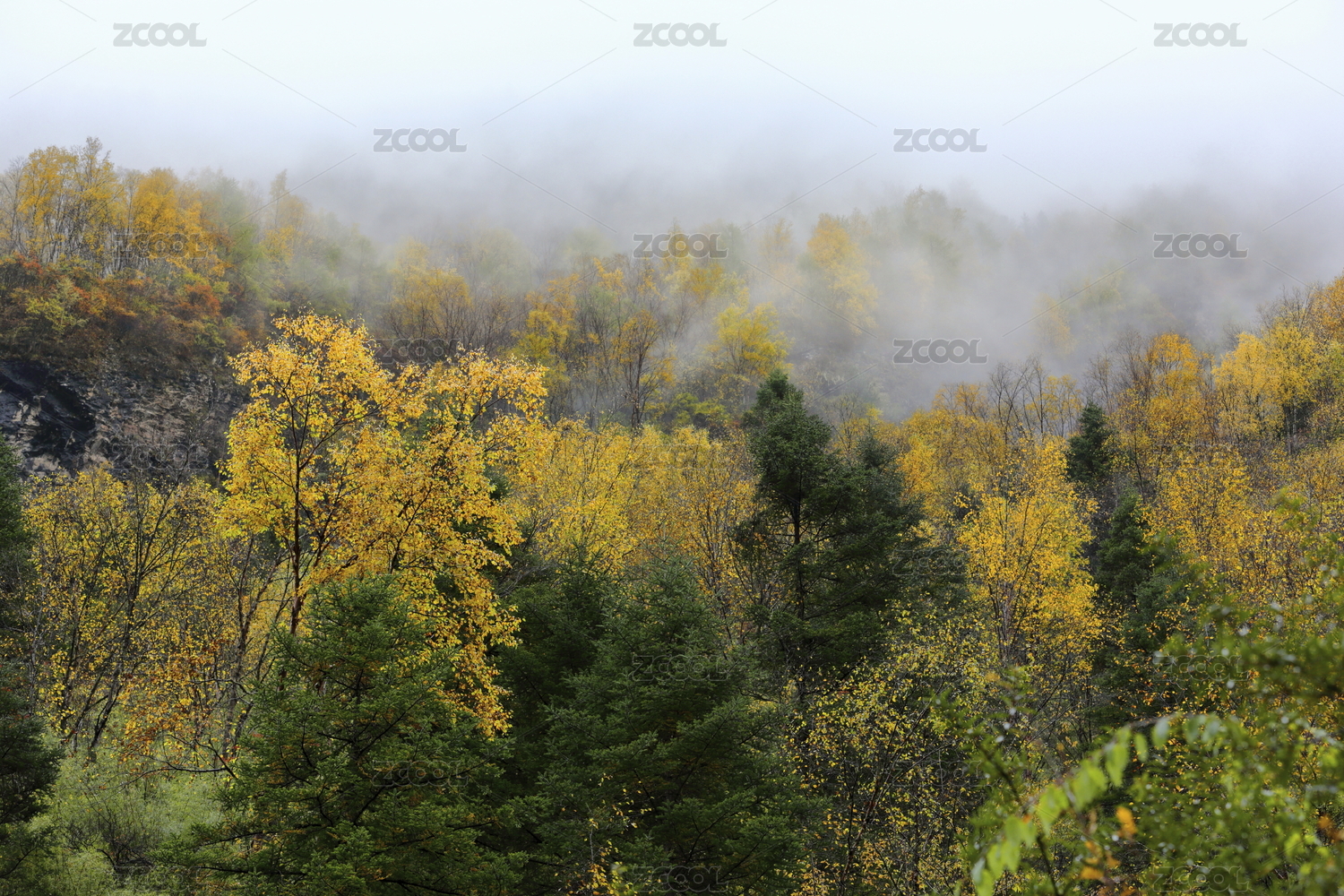 中国四川阿坝州奶子沟彩林云雾缭绕悬崖峭壁